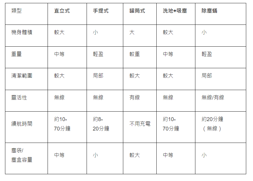 虽然现在最流行的吸尘机以直立式为主,然而市场上还有其他类型的吸尘机,用途功能不尽相同,稍为了解一下特性,更容易找到适合阁下的类型。