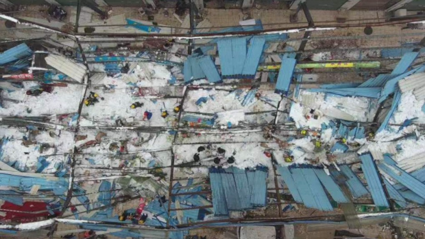 网上流传现场影片及照片显示,坍塌菜市场范围呈长方形,面积巨大,周边建筑及坍塌后的市场,均有厚厚积雪,消防人员正在从瓦砾中搜索被困人员。