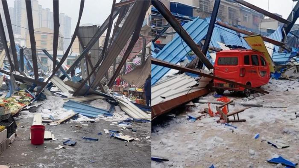 ▲湖南益阳菜市场疑遭积雪压塌,暂救出6人。