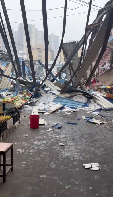 ▲湖南益阳南县人民路有菜市场坍塌,伤亡未明。影片截图