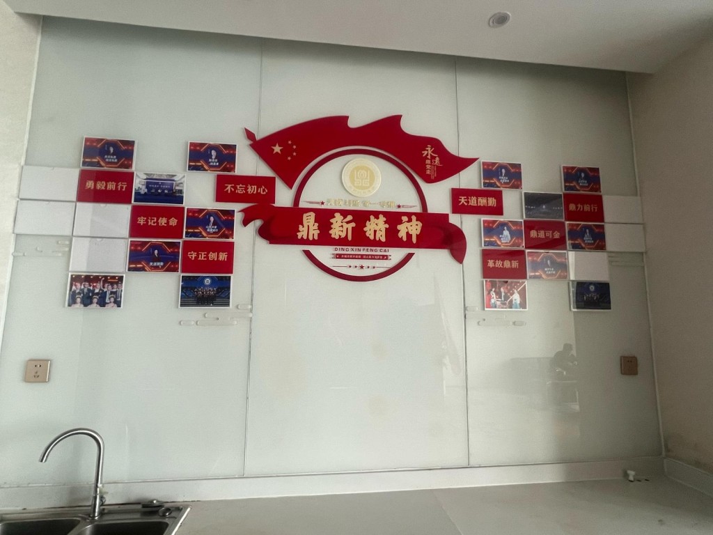 ▲办公室展示“鼎新精神”:“无我、利他、专一、守信”。