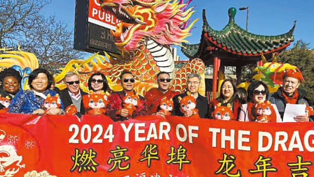 美中餐饮协会会长郑时坦、美亚健康协会行政主任刘红、华埠特别活动委员会创会人李双振分别致辞祝贺大家龙年吉祥、万事如意、大吉大利。 亚裔文化中心徐婕雯校长,当天特别感谢天宇文化传播公司自2019年开始每年都赞助的大型花灯,让中外游客前来唐人街打卡拍照,与华人一起开心的过春节。 徐婕雯当天称,立春之后,就正式踏入龙年了,她代表主办方祝福大家龙马精神、家庭幸福、健康如意。