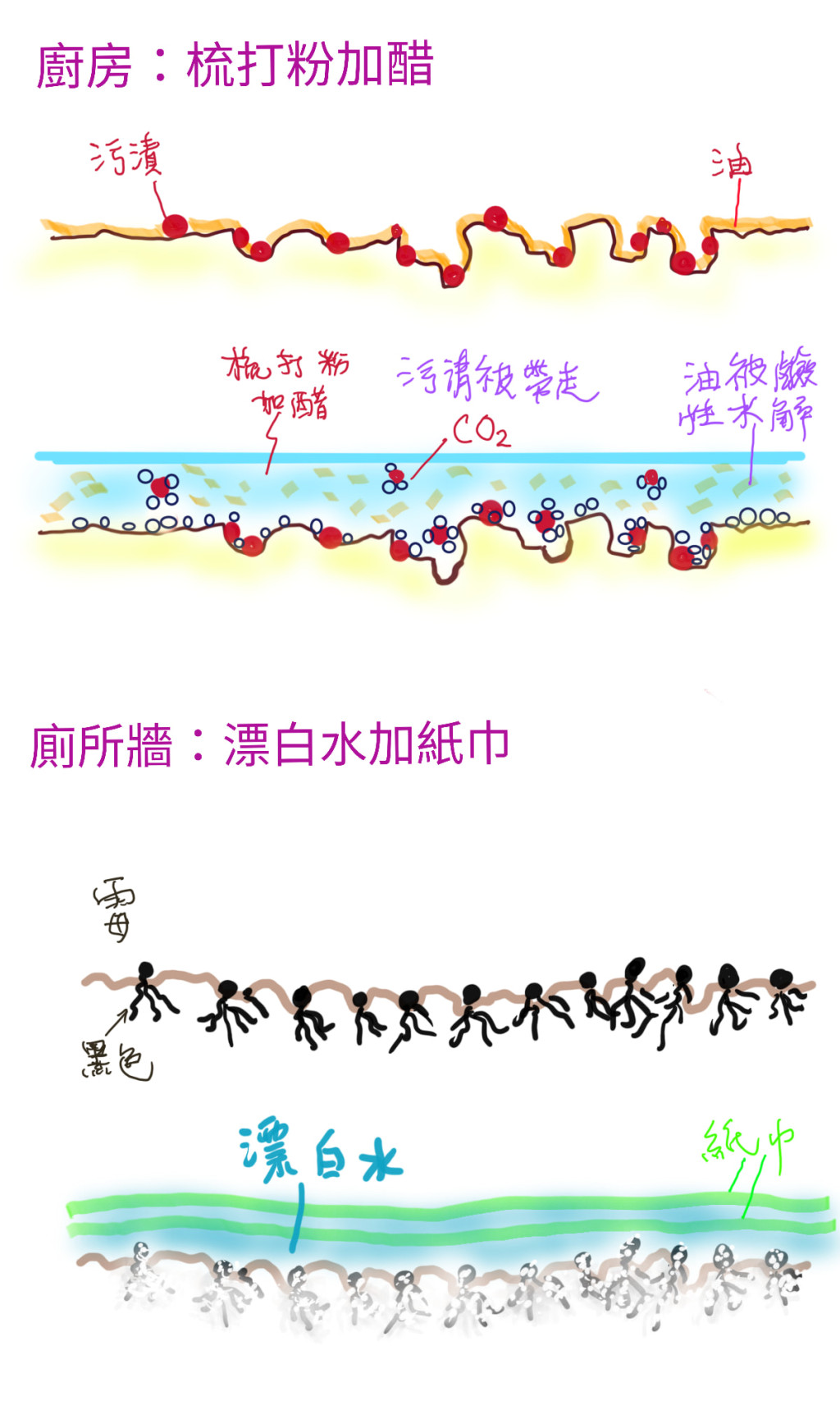 更顽固的污渍可以加少少醋入梳打粉,醋同梳打粉反应会产生二氧化碳,气泡会帮助除去污渍。 CH3COOH → CH3COO^- + H^+ HCO3^- + H^+ → H2O + CO2