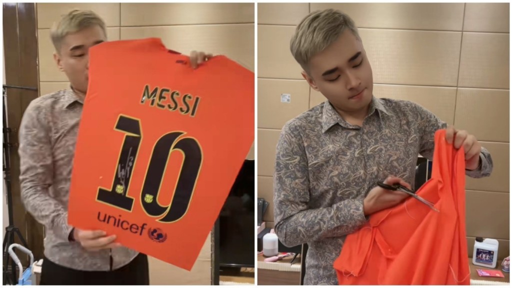 ▲内地球迷怒剪价值数万人民币的梅西签名球衣。