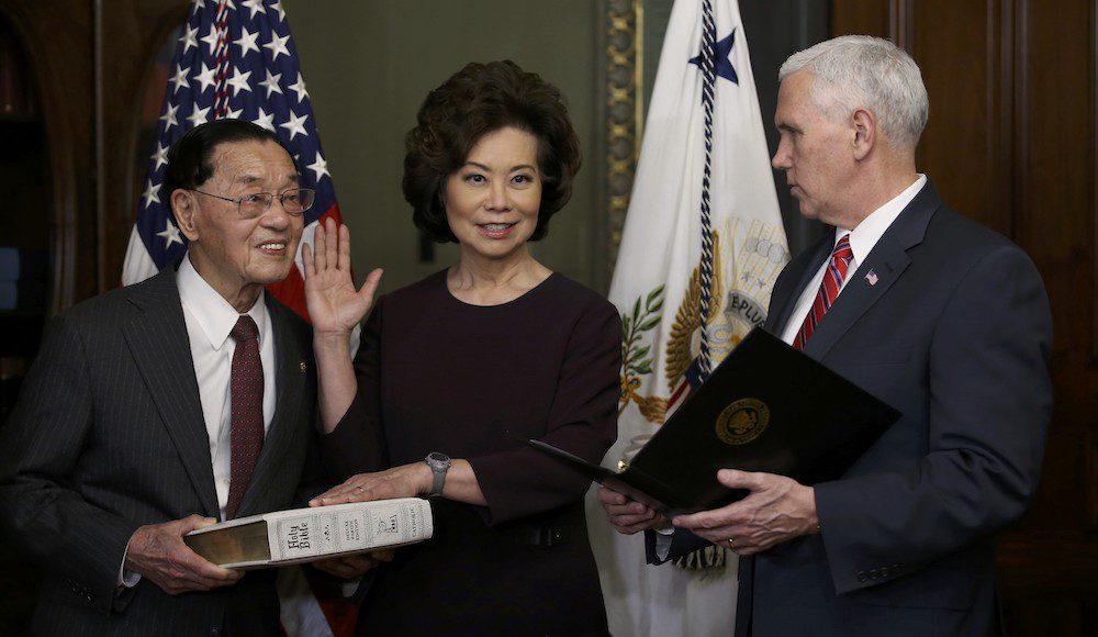 ▲赵小兰在父亲陪同下,2017年宣誓成为美国运输部长。路透社