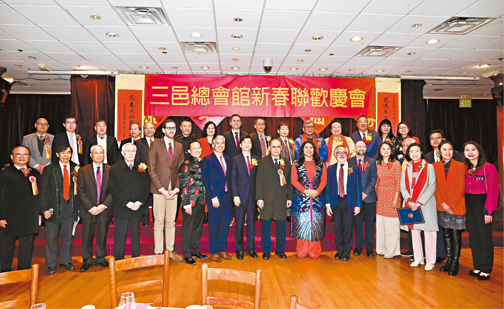 中午12时,三邑总会馆假座华埠康年酒家举行新春团拜活动,中领馆总领事张建敏、领侨处处长王一鸣、领事姚遥;旧金山(又称”三藩市“)市长布里德、州参议员威善高、加州检察总长 Rob Bonta 、市参事会主席佩斯金、市行政官朱嘉文、市参事陈诗敏、市参事殷嘉立、市府律师邱信福、州众议员丁右立助理伍玉珍等莅临祝贺并颁发贺状;中华总会馆总董暨宁阳总会馆主席雷振泽及主席团;旧金山湾区中国统一促进会理事长池洪湖;会长李国宏;旧金山中华总商会会长黎伟杰;星岛日报美西版社长梁建锋;东华医院行政总裁张建清,三邑总会馆董事、邑侨乡亲、侨团首长、社会贤达、嘉宾出席联欢,共襄盛会。