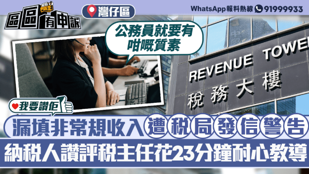 程小姐坦言作为一位普通巿民,实在难以清楚报税的每一项细节,故收到警告信后难免感觉徬徨,幸好评税主任王小姐不厌其烦,更花上长达23分钟聆听其解释及需要,再清晰指导如何向税局申辩的程序,直指“公务员就系应该要有咁嘅质素去帮助巿民”,因此透过《星岛申诉王》的“我要赞佢”平台,表扬王小姐这位耐心又细心的优质公务员。