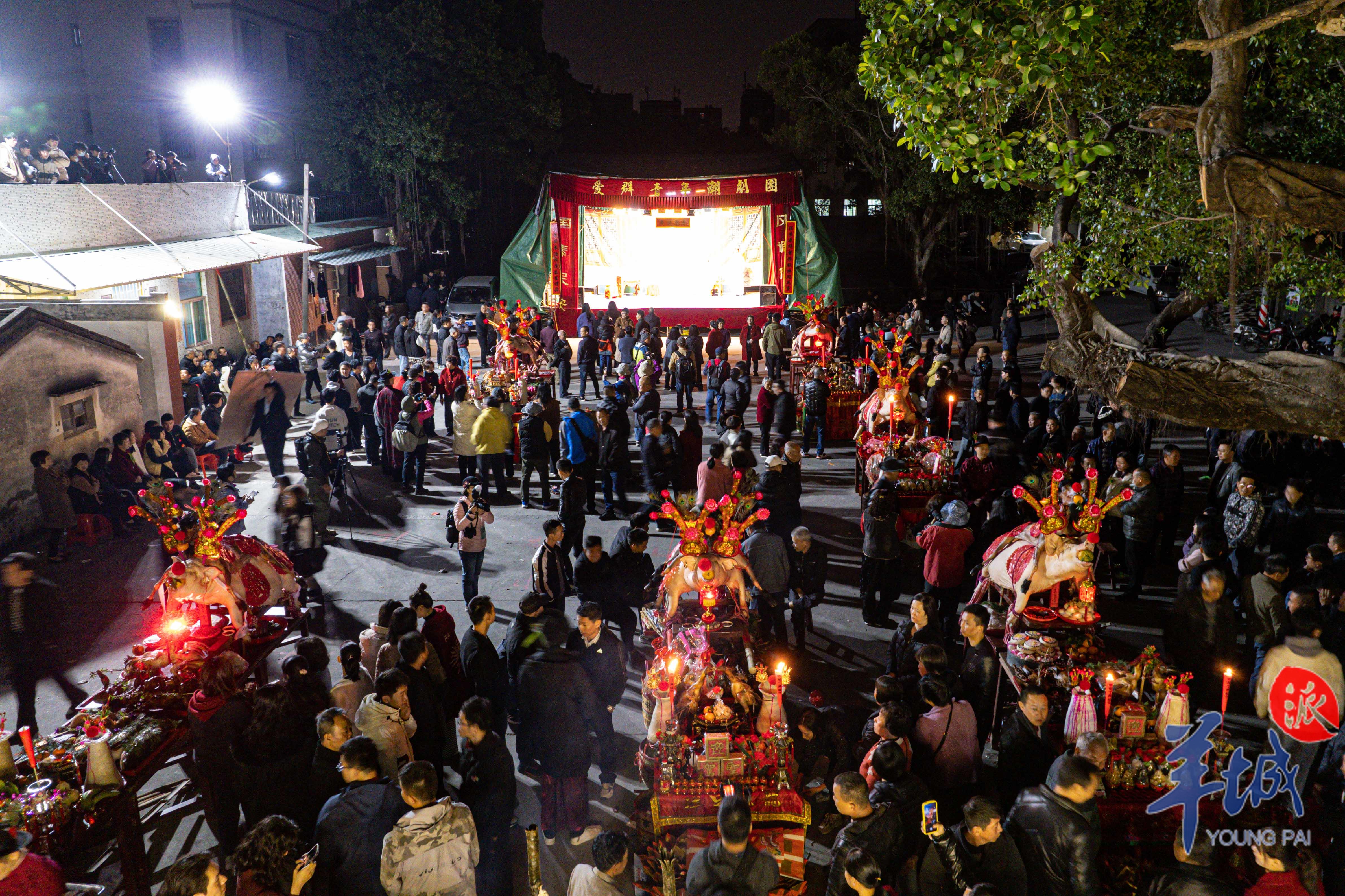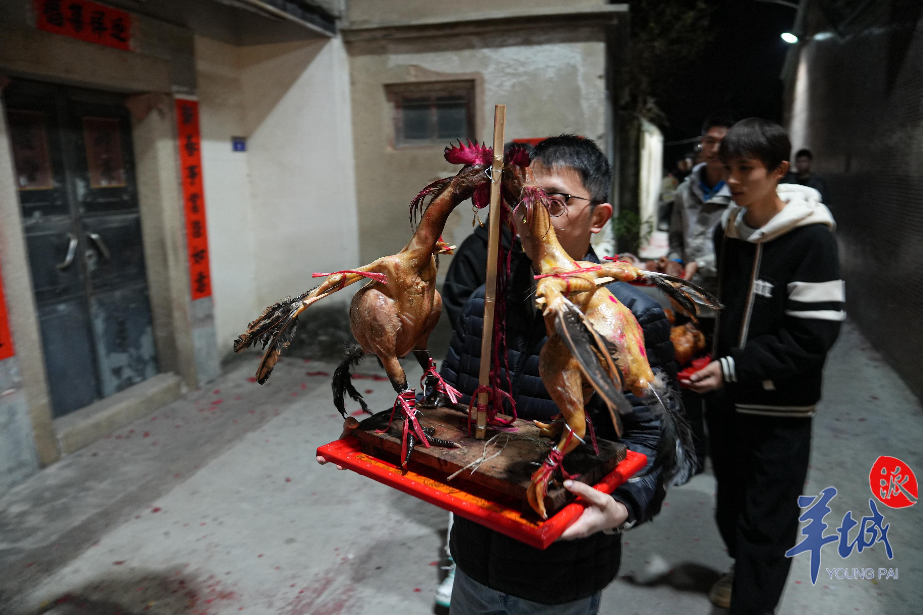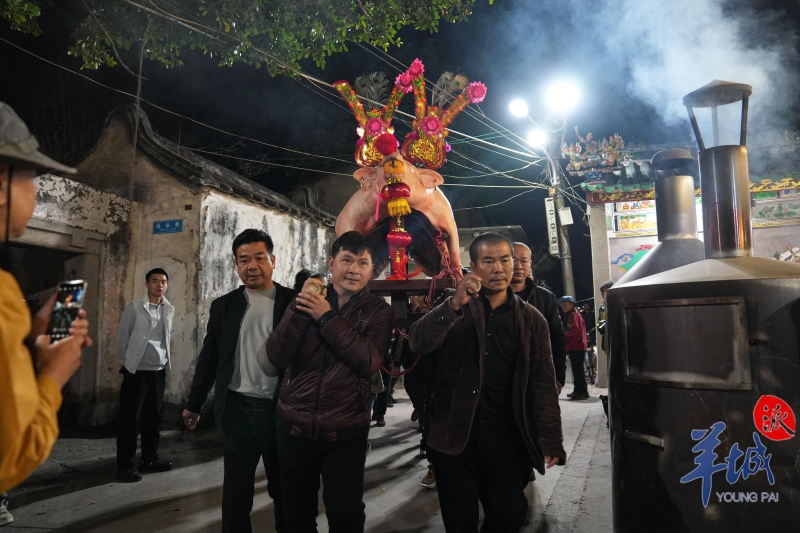 当天凌晨五点,“赛大猪”现场人山人海,“丁头”人家在村里太保爷宫前用特制的木架架起大猪,猪的嘴巴里含着桔子,寓意大吉大利,背上贴着红色的“喜”字,有些大猪背上还叠上一只小羊,俗称“全副猪羊”,祈求幸福安康。