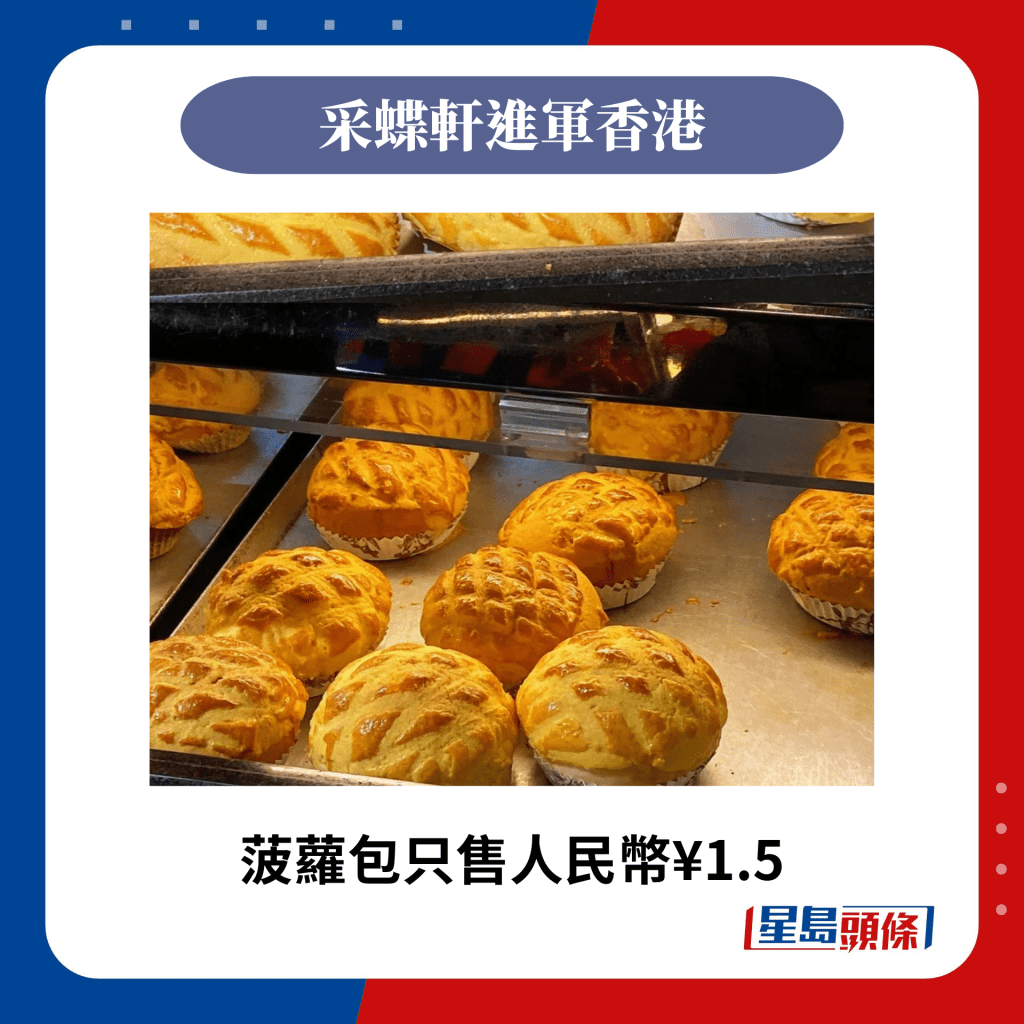 内地主打平、靓、正的西饼面包品牌“采蝶轩”即将进军香港,以月租28万在湾仔联泰大厦地下租下两个铺位,令人十分期待! 采蝶轩主打以相当亲民的价钱售卖港式面包西饼,包括菠萝包、港式豆沙包、葡挞、冬甩、流心芝士挞等,售价低至¥1.5,性价比非常高!