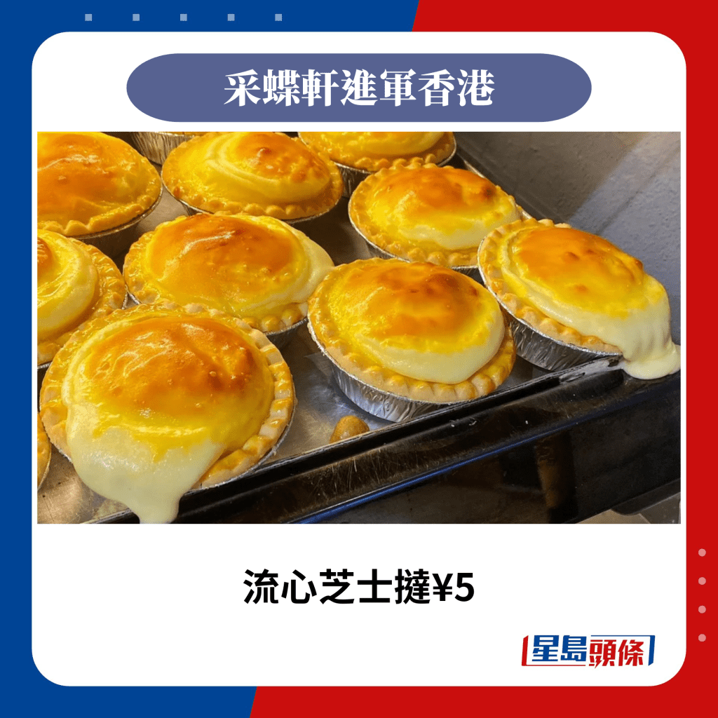 来自内地安徽省的人气面包店品牌“采蝶轩”,属于“采蝶轩食品集团”企业旗下的品牌之一。 企业于1981年创立,1993年起全面拓展面包西饼连锁店市场,至今在华东地区拥有超过300间直营连锁店。 “采蝶轩”主要售卖港式面包、西饼、蛋糕、中式糕点等,价钱非常优惠,包括菠萝包只售人民币¥1.5、港式豆沙包¥2、冬甩¥3.5、流心芝士挞¥5等,未知香港店售价能否继续走平民路线?