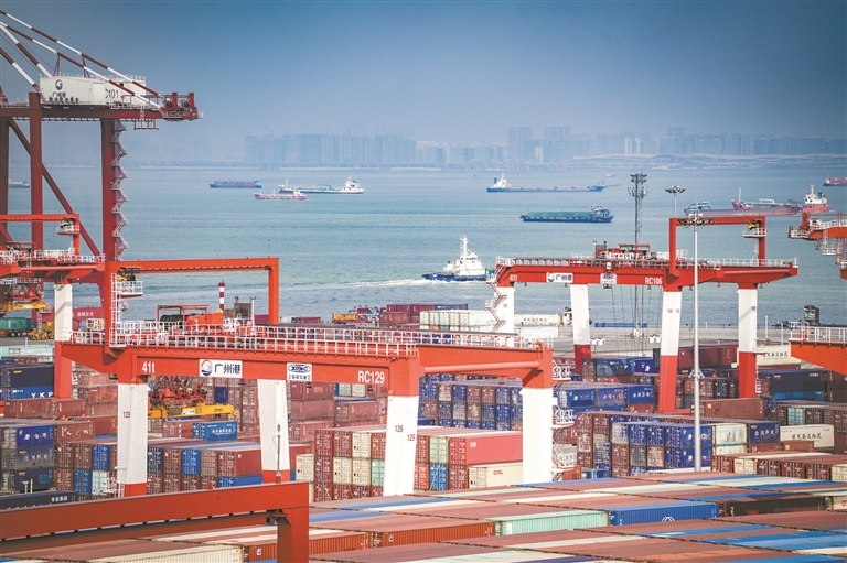 ▲多彩的集装箱、频繁移动的龙门架、海上的货轮共同描绘出繁忙的南沙港。