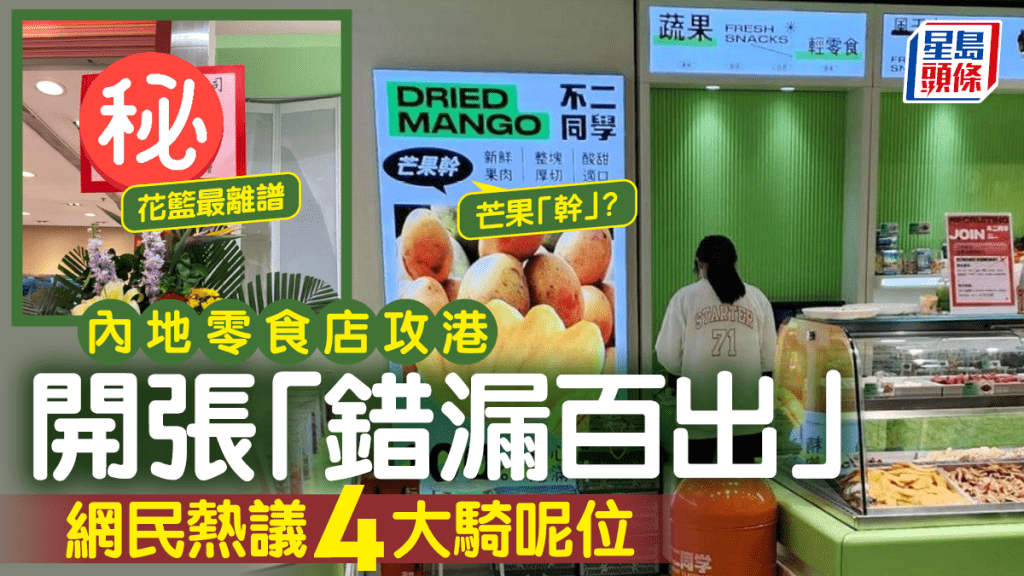 近年内地品牌攻港已成风潮,部分做足功课配合香港文化,部分则似“不熟地头”,搞不清中、港文化之别,以致弄出笑话。有港人在网上发文,发现近日内地零食店“不二同学”在大埔开设新店,而店内广告更出现多个“骑呢位”,除了繁简文字转换“半桶水”,令港人一头雾水,甚至以为在说粗口,而门外摆放的新张花篮更是错得离谱?