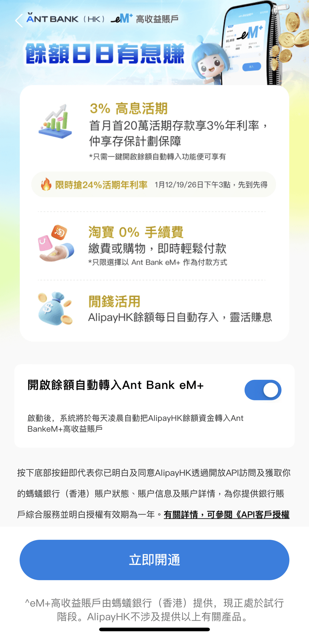 蚂蚁银行续与AlipayHK合作。在最新推广下,蚂蚁银行简化高息存款程序,AlipayHK 用户一次授权后,即可将 AlipayHK余额升级存入Ant Bank eM+账户赚息。其中,首30万港元存款有较高利息,首5万港元存款年利率为1厘。而30万或以上存款活期存息只有0.001厘,明显低于主流银行所提供的0.875厘。