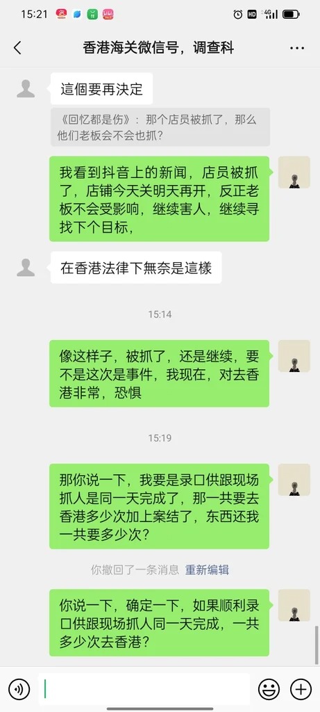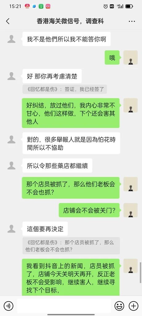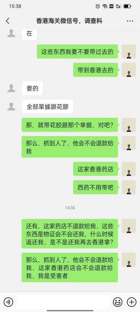锶锶称曾致电海关热线投诉,第二日收到一通来电3759 3205,对方自称是海关调查科人员,要求女事主加微信号“调查科”(昵称正义超人)的微信号,双方成为好友后,道出自己受骗的事发经过及证据,对方声称“可向法庭申请赔偿令”,但前提是“花胶及单据我们会先检取作证物,案子完了会还给你”,又言之凿凿声称相关证物会视乎上司是否用作证物, 经法庭审理案件完结后归还,又解释骗旅客药店继续存在源于“很多举报人就是因为怕花时间而不协助,所以令那些药店都继续(营业呃人)”游说锶锶来港居住2日1夜录取口供,最终女事主以需加多考虑为由而暂时与对方终止对话。