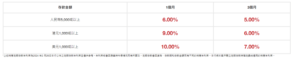 不少南向通客有多元化产品配置需求,会将人民币兑换成其他货币叙造定存。 对此有银行亦推出不少高息港元定存。中银香港1个月、3个月及6个月期定存,年息均高达6厘,半年期可享6厘年息,已高过市面上一般香港市民可享的港元定存产品。需要客户兑换资金5万港元或以上,并同时开立定存账户。 工银亚洲亦提供3个月、6厘年息定存,1个月更高达9厘年息,门槛额为1000元;汇丰及恒生则为合资格新资金所开立定存提供VIP客利率。