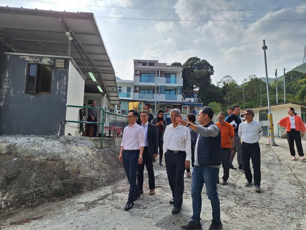 ▲沙田民政专员余怀诚(白恤衫戴黑框眼镜者)连同运输署代表及小巴营运商到黄竹洋村视察实况。(民政事务总署fb)