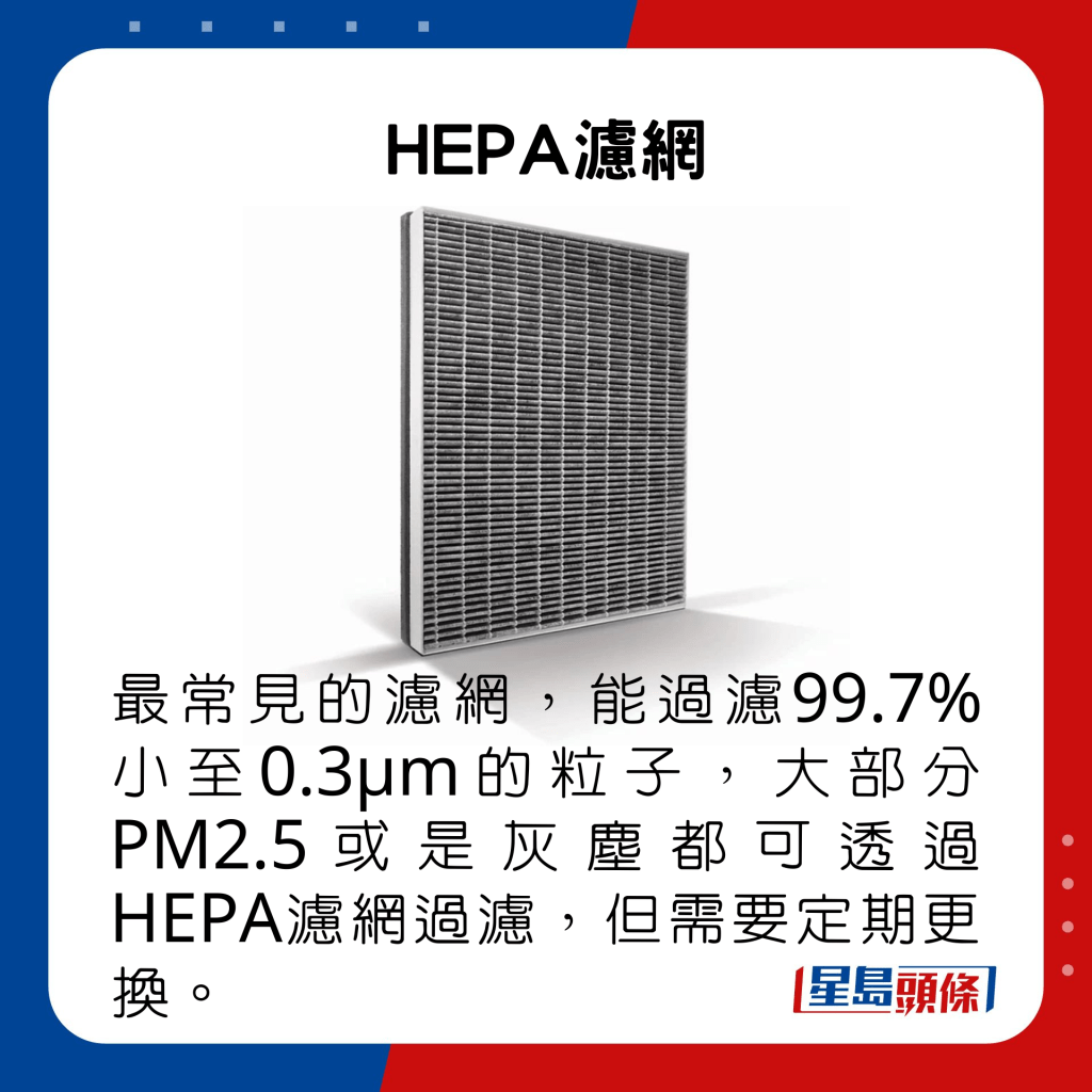 目前最常见的滤网,由纤维制成,能够过滤99.7%小至0.3μm的粒子,大部分PM2.5或是更大的灰尘都可以透过HEPA滤网过滤,但留意滤网不可重用或以水清洗,需要定期更换积了尘的滤网。