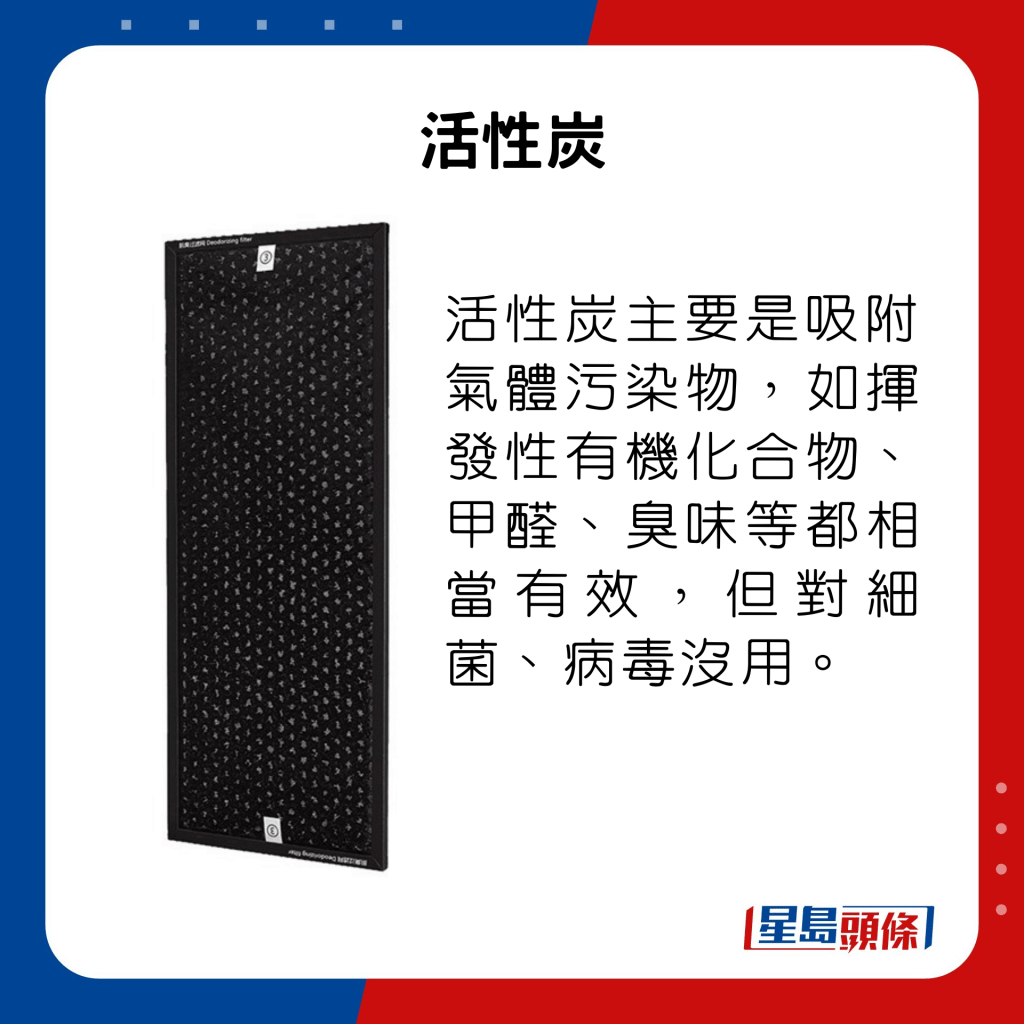 活性炭主要是吸附气体污染物,如挥发性有机化合物、甲醛、臭味等都相当有效,但对细菌、病毒起不了作用,也不可净化空气中的灰尘,一般可持续使用3个月至6个月,当吸附能力饱和后便需更换。
