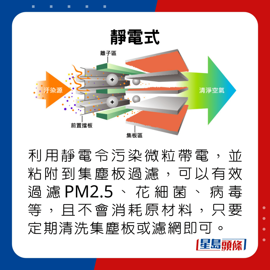 利用高压电产生静电,让污染微粒带电,并粘附到集尘板过滤,可以有效过滤PM2.5、花粉、细菌、病毒等,且不会消耗原材料,只要定期清洗集尘板或滤网即可,但高压电可能产生臭氧,所以最好选择符合标准的型号。