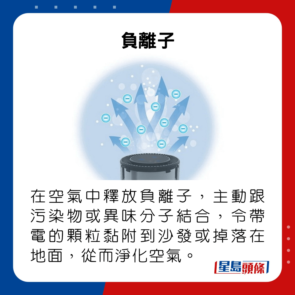 在空气中释放负离子,主动跟污染物或异味分子结合,令带电的颗粒黏附到沙发或掉落地面,从而净化空气,但净化能力随距离快速㴲减,而且只能抑菌,不能杀菌。