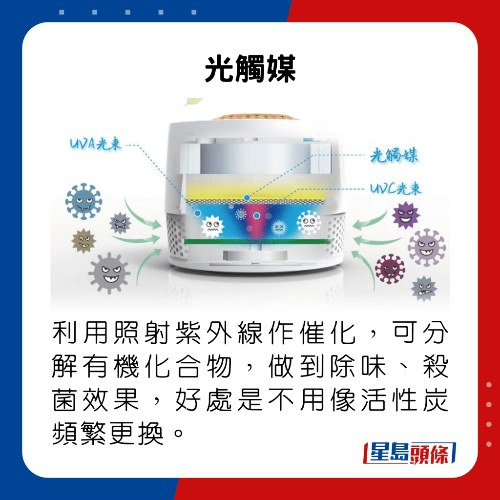 利用照射紫外线作催化,可分解有机化合物,做到除味、杀菌效果,好处是不用像活性炭频繁更换,但需照射紫外线方有作用,故须内置特定波长之UV灯。