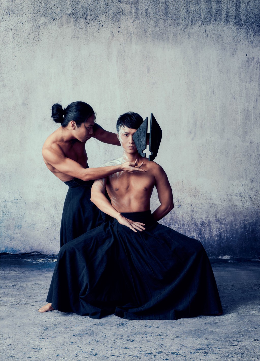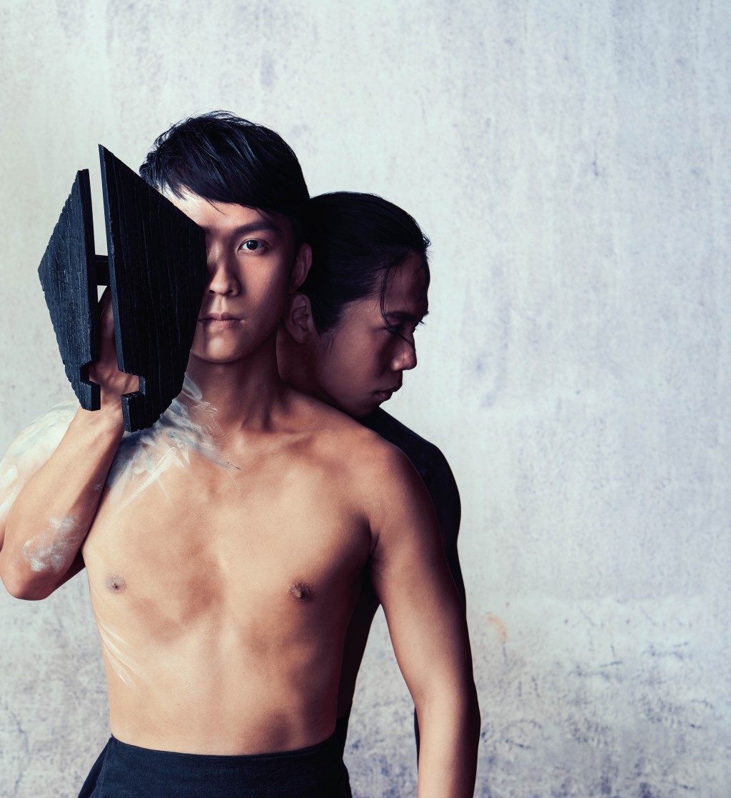 整片空无中透出幽灵般的身影,舞蹈员的身体慢慢移动,战雾里映出一道历史的身影——兰陵王,正是《兰陵.入阵》的主角。真实存在于历史里的兰陵王,生于宗室,以战功称王,骁勇善战的他胜仗连连,史书所记,唯一与他作为“王”的形象违背的,是他柔美阴柔的声相面貌。作品起自兰陵获册封为王,即使内心豪壮,擅长武艺,自认为不足以震慑敌人的他,只能披面具上阵。披假面上阵的兰陵王,在面具掩护下,成为众人的勇悍范样;落下面具,仍然是他本色为王的刚敢。