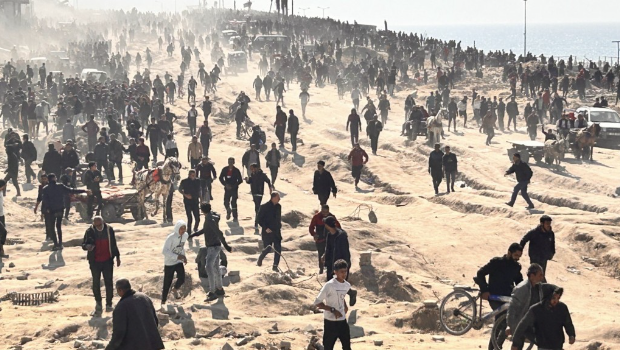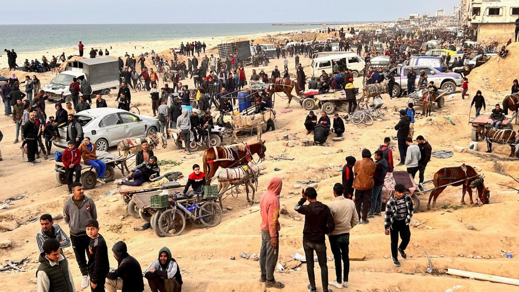 ▲2月25日,巴勒斯坦人涌往加沙城一处海滩等待救援物资。 美联社