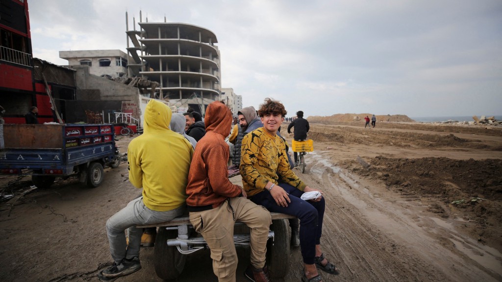 ▲巴勒斯坦人乘坐驴车穿越受损的沙滩路。 路透社