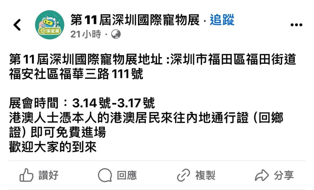 ▲港澳居民凭回乡证可免费入场。(图片来源:Facebook@第11届深圳国际宠物展 )