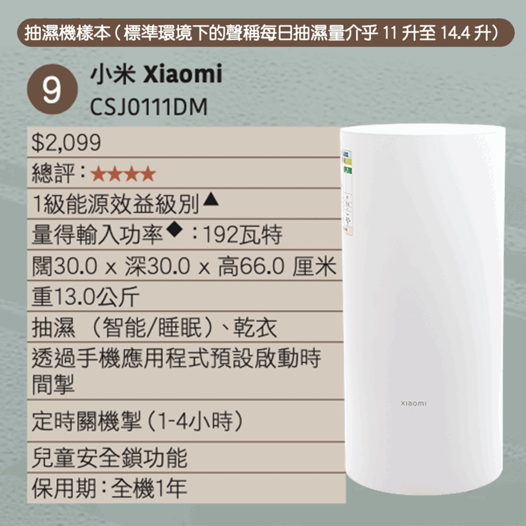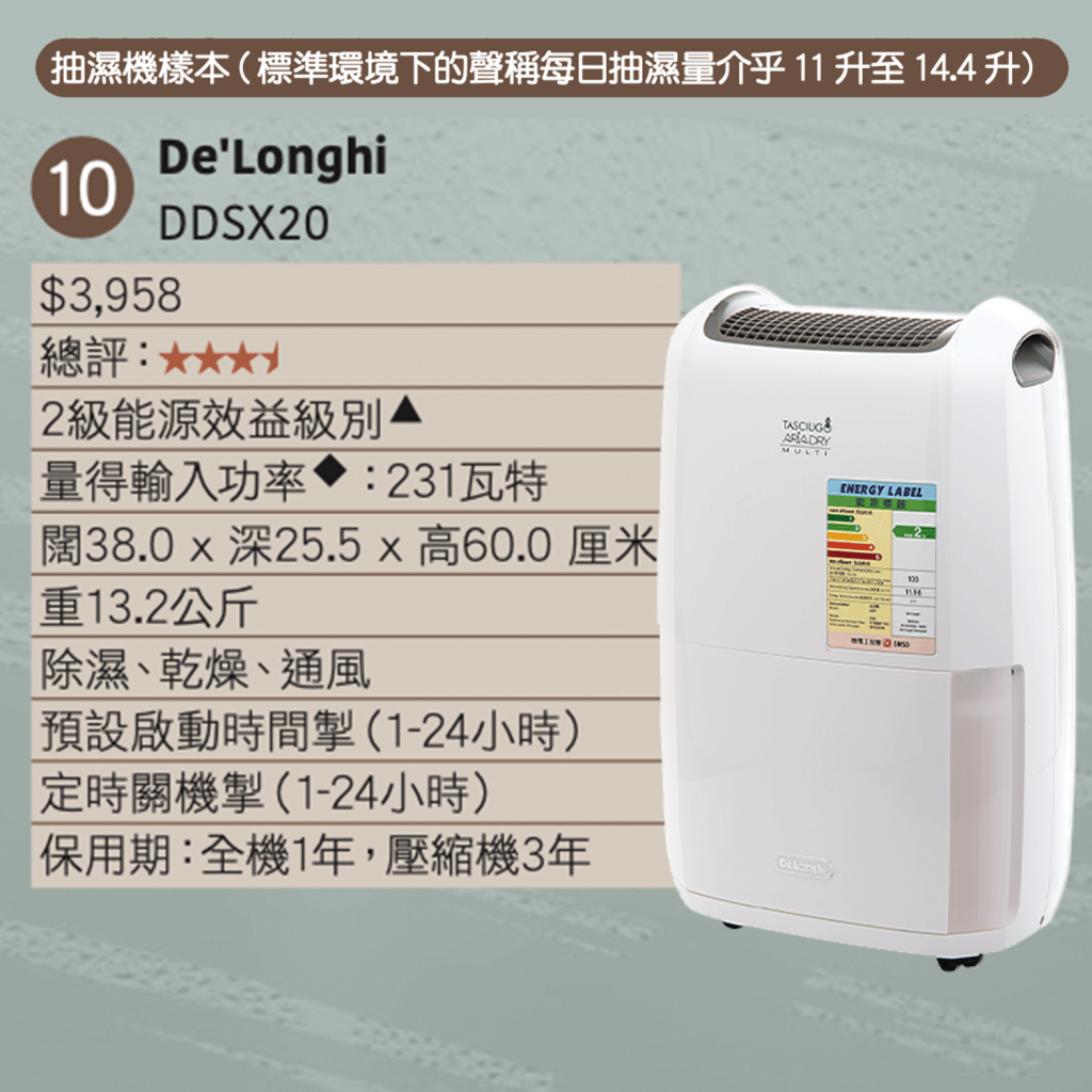 今次消委会测试了以下14款抽湿机,包括:包括飞利浦DE5205/39、飞歌 PDA22WWX、Panasonic F-YAU21H、惠而浦 DS242HG、三菱电机 MJ-E160HR-H、LG MD16GQWE0、东芝 RAD-Y300H、日立 RD-290GX、小米 CSJ0111DM、De'Longhl DDX20、金章牌 ZD2888、开利 DC-190A-X、正负零 XQJ-C010(II)及伊玛牌 IDH-2099L。
