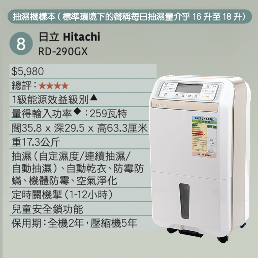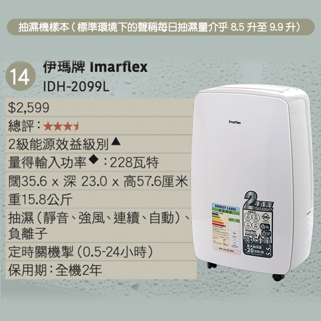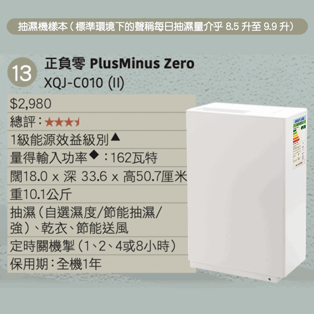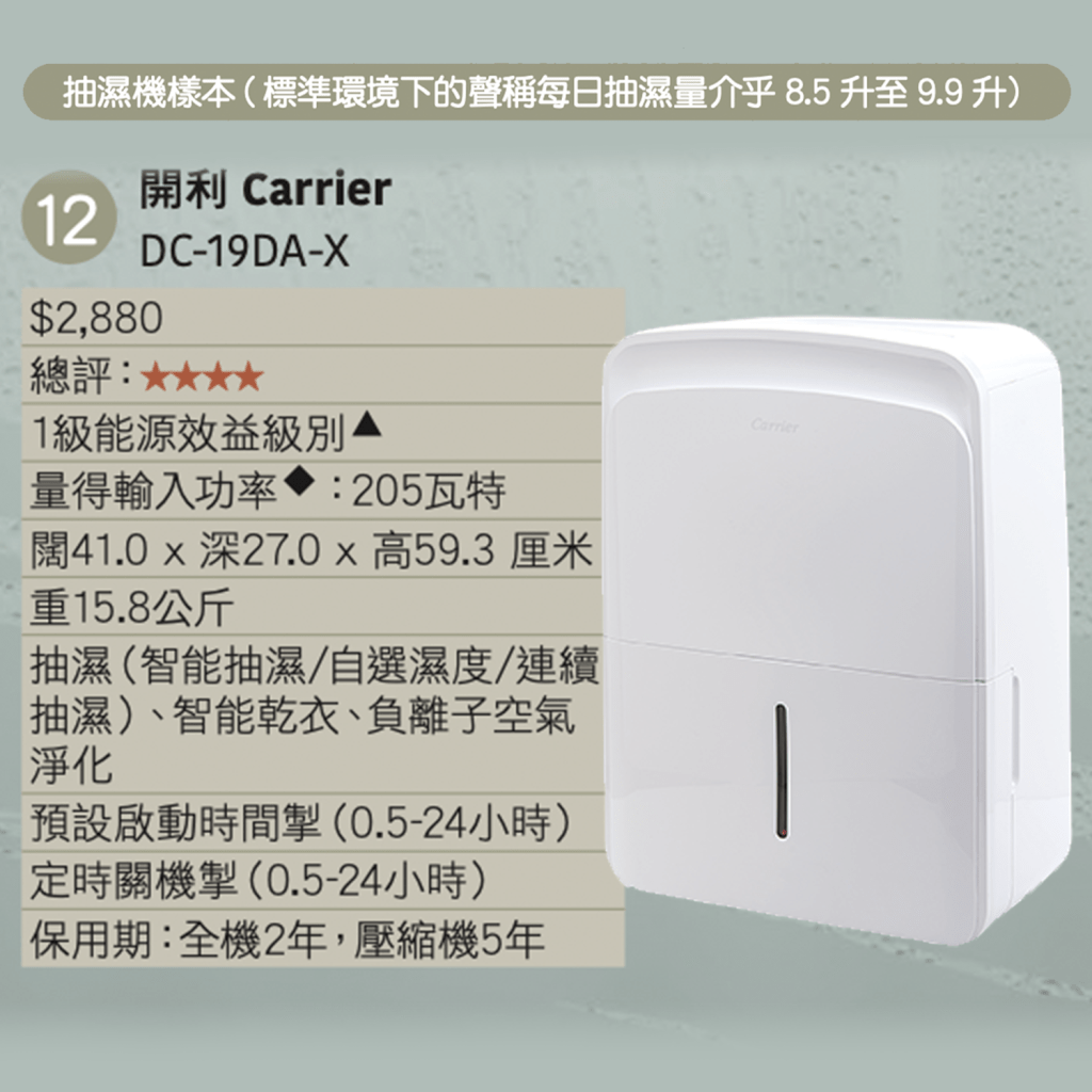 结果显示,各样本于标准环境及有安装过滤器的情况下,量得的每日抽湿量由8.5升至17.8升。其中1款“开利Carrier”抽湿机样本的每日抽湿量较其额定数值高出23.8%,惟有6款样本包括“飞歌 (Philco)”、“Panasonic”、“ LG ”、“ 东芝 (Toshiba)”、“ 日立牌 (Hitachi)”及“伊玛牌 (Imarflex)”,所量得的每日抽湿量分别低于额定数值0.6%至5.3%。