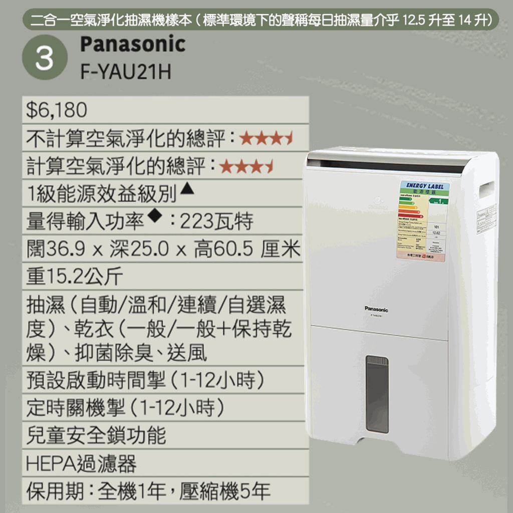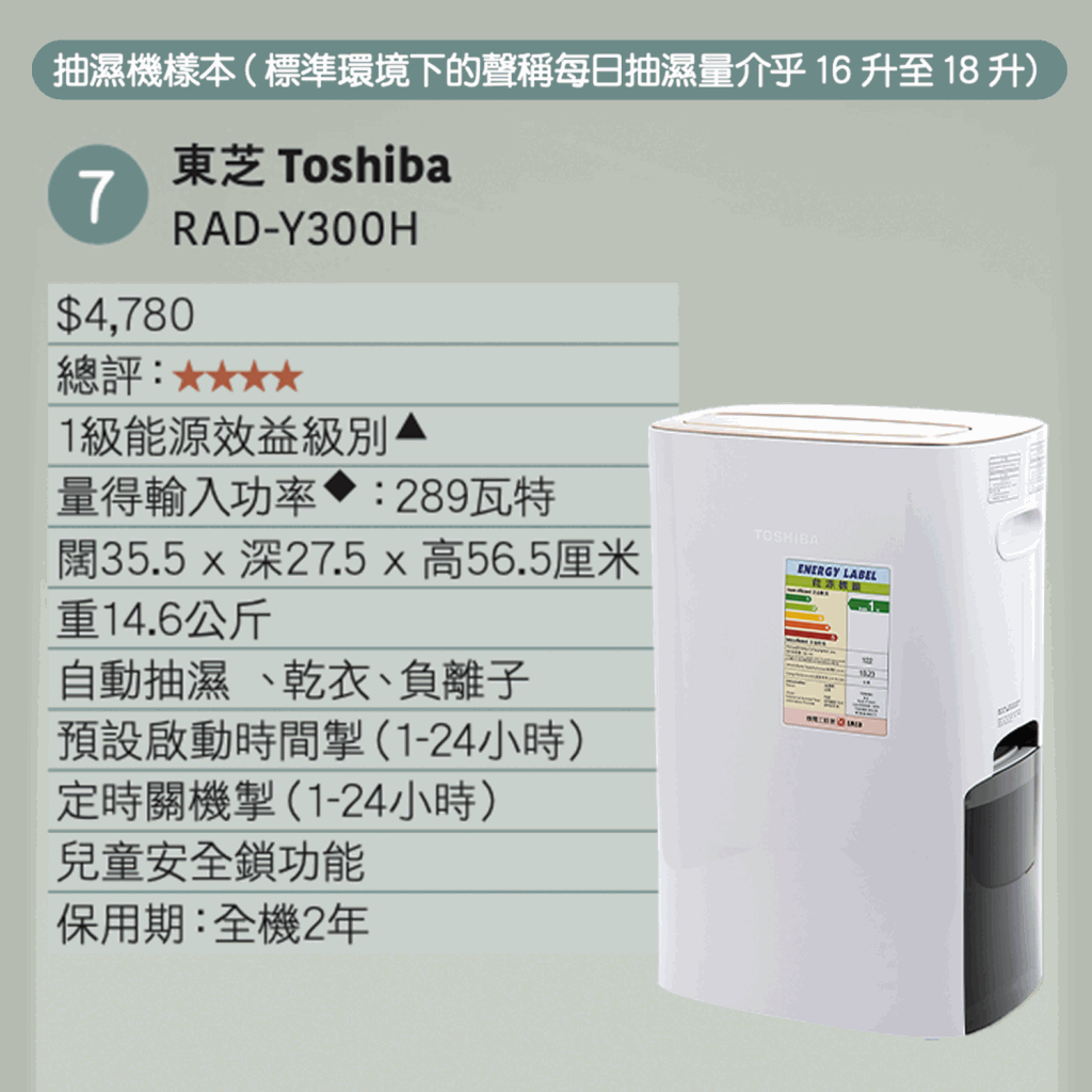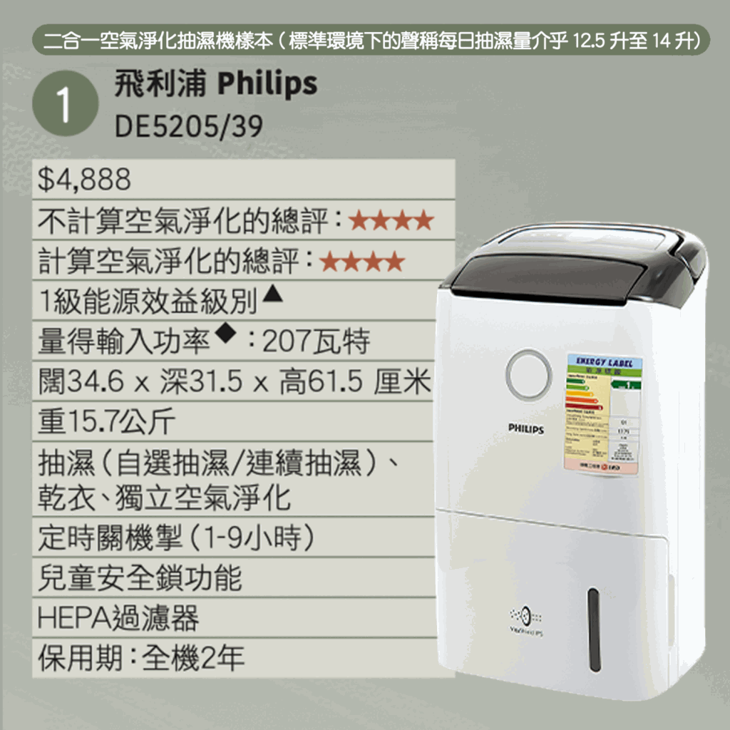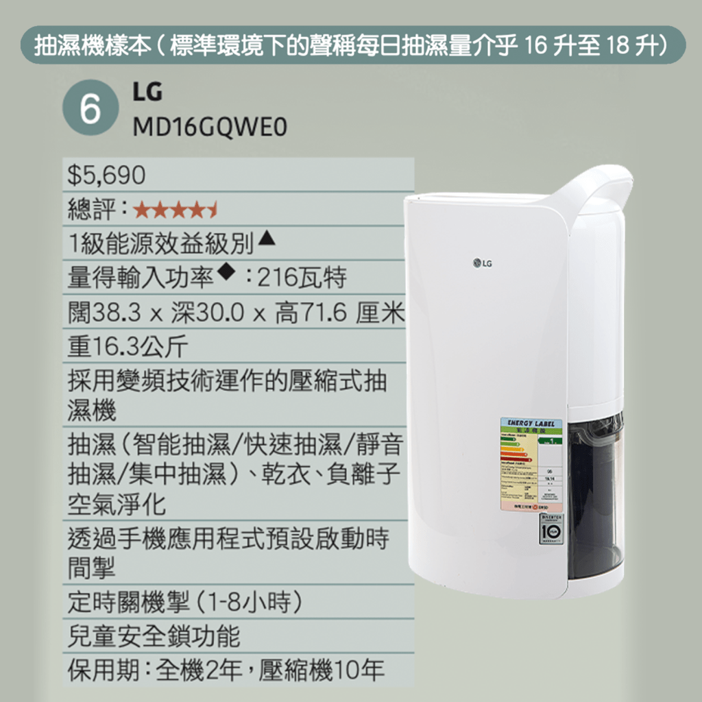 结果显示,各样本于标准环境及有安装过滤器的情况下,量得的每日抽湿量由8.5升至17.8升。其中1款“开利Carrier”抽湿机样本的每日抽湿量较其额定数值高出23.8%,惟有6款样本包括“飞歌 (Philco)”、“Panasonic”、“ LG ”、“ 东芝 (Toshiba)”、“ 日立牌 (Hitachi)”及“伊玛牌 (Imarflex)”,所量得的每日抽湿量分别低于额定数值0.6%至5.3%。