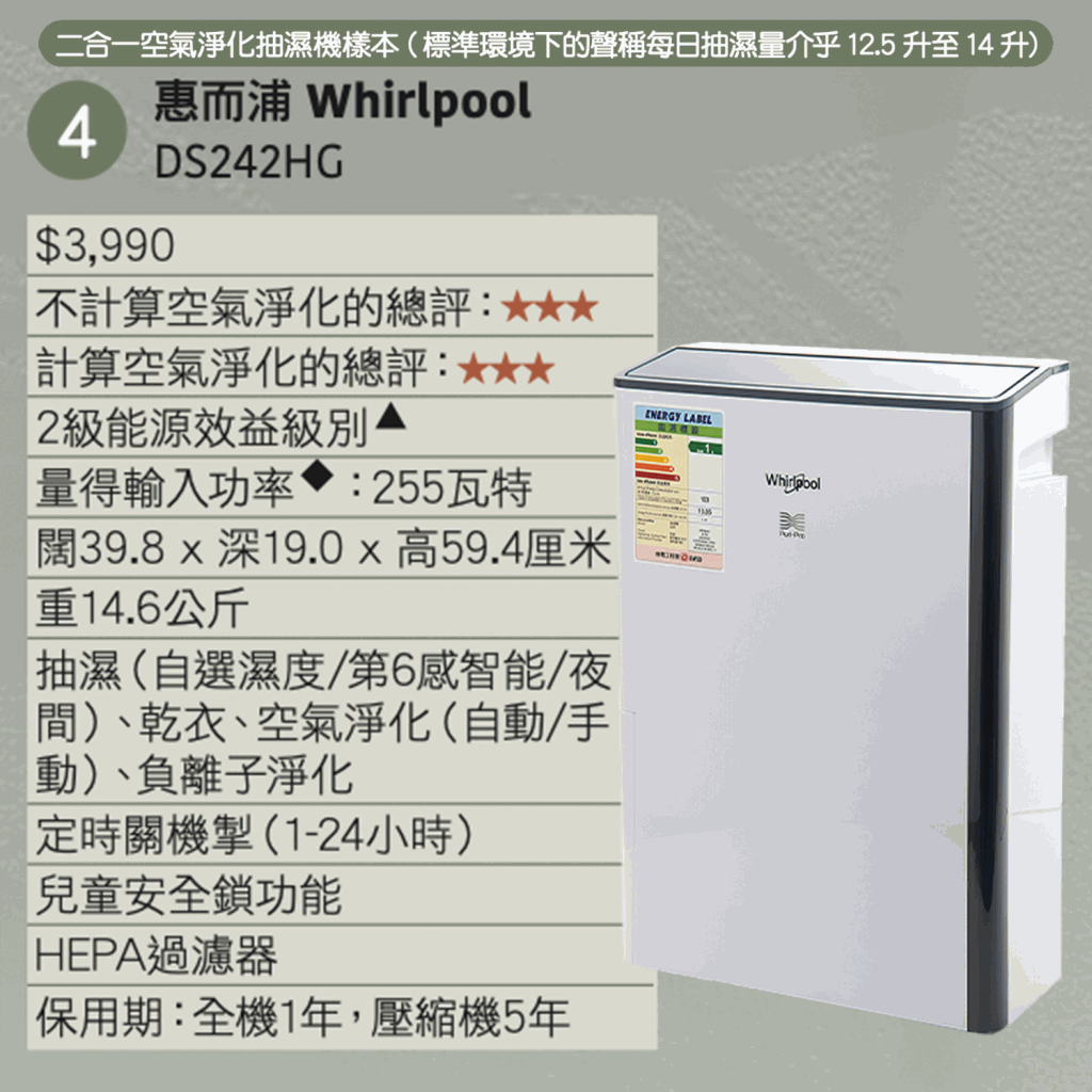 另外有2款随机附送HEPA过滤器的样本,分别是“惠而浦 (Whirlpool)”及“金章牌 (Zanussi)”,在没有安装过滤器的情况下量得的抽湿量与厂商声称的相若,但在模拟消费者日常使用时会安装HEPA过滤器的情况下测试,结果发现在标准环境下量得的每日抽湿量,较其声称数值分别低约13.2%及23.1%,在厂商惯用环境下更分别低约14.7%及41%,差异甚大。