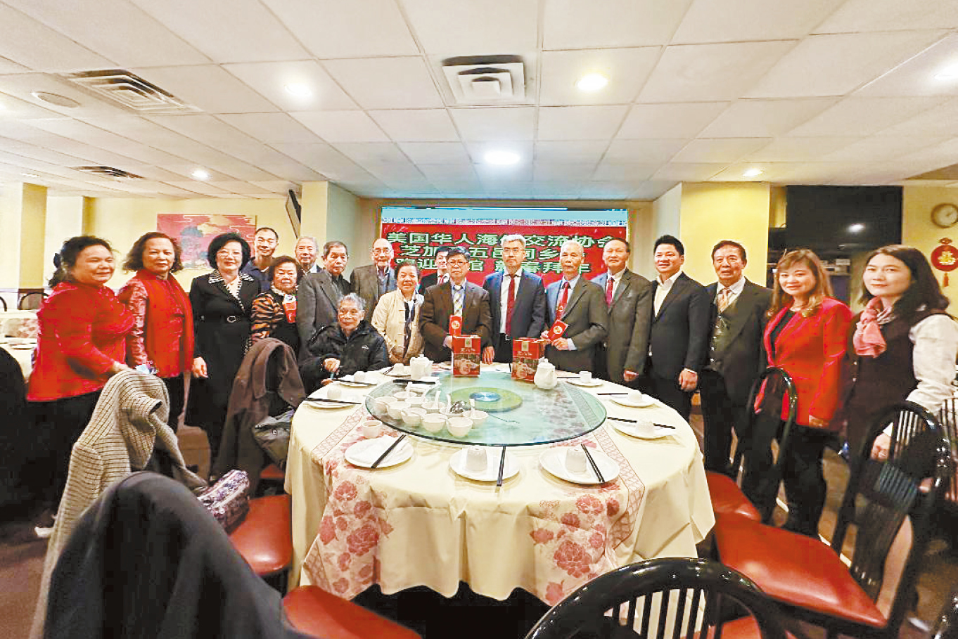 ▲赵建总领事(前中)在新春团拜中首站到了华联欢,得到全体同仁热烈的欢迎。梁敏育摄