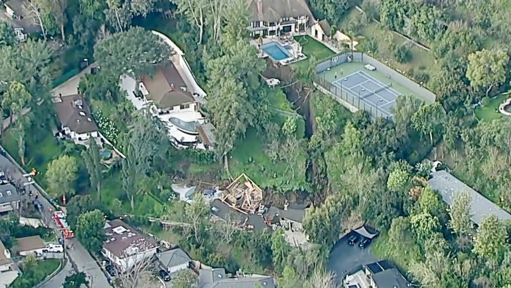 美国加州洛杉矶谢尔曼橡树区(Sherman Oaks)周三凌晨发生山泥倾泻,破坏一处后院并波及至少3栋房屋,其中一栋房屋因地基受冲刷,整个庭院移位,泳池悬在断崖边,令人想起去年9月香港红山半岛的豪宅也因为暴雨引发山泥倾泻,导致独立屋地基外露及悬空。