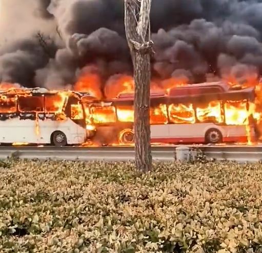 根据现场民众拍下的影片显示,前方的巴士及后方的旅游巴车体完全燃烧,窜出的黑烟直冲天际,由于火势过于猛烈,一旁开过的车辆赶紧迅速驶离,避免受到波及。