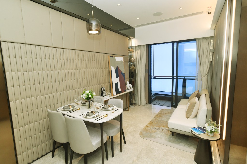 发展商同步开放2个交楼标准示范单位参观,其中2座8楼A07室为蓝本,面积423方呎,2房间隔,间隔四正,易于摆放家具,另参照1座8楼A02室打造的示范单位,面积339方呎,2个单位客饭厅均配以落地玻璃趟门,坐拥户外美景。