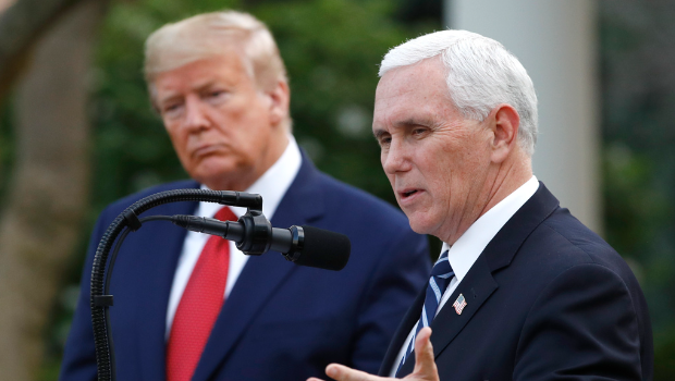 ▲美国前副总统彭斯(右)2020年1月与前总统特朗普(左)于白宫简报时的画面。彭斯(资料照/美联社)