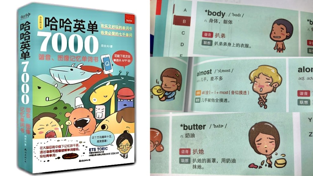 近日有网友在小红书发文批评某英文单词书,指当中许多单词的谐音和联想记忆法令人恶心。例如between(在……之间)这个词谐音是“笔臀”,联想记忆方法为“将笔夹在双臀之间”,care(关心)则是谐音“K儿”,联想成“因为关心才K(打)儿子”,令读者感到莫名奇妙。