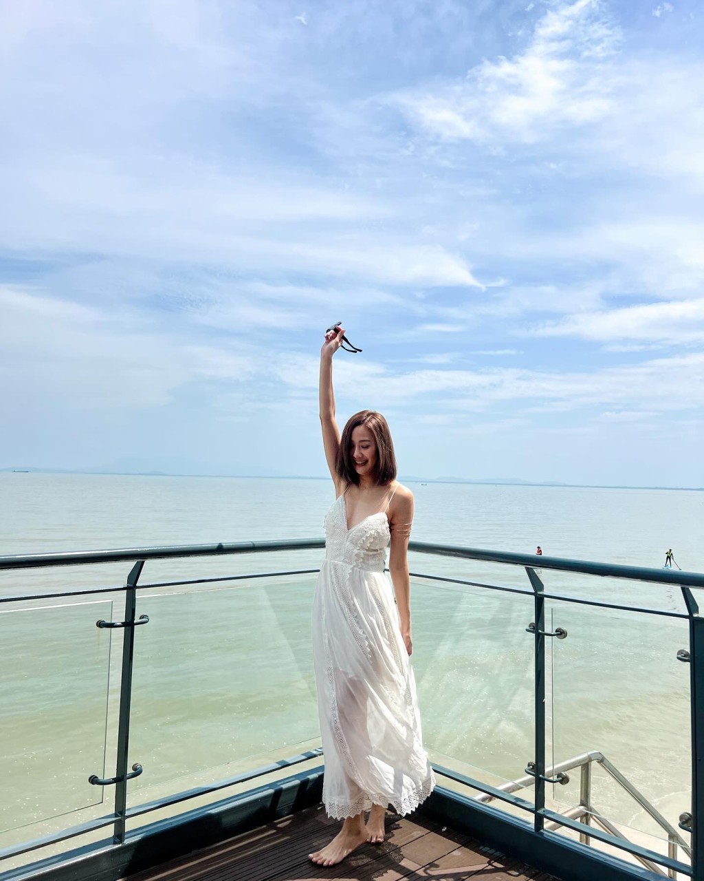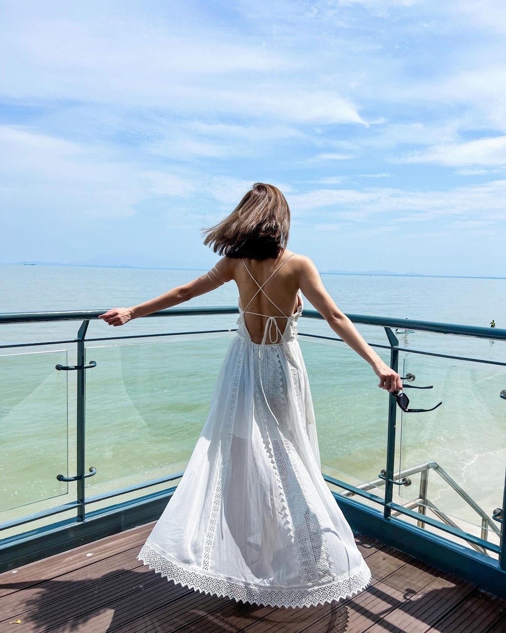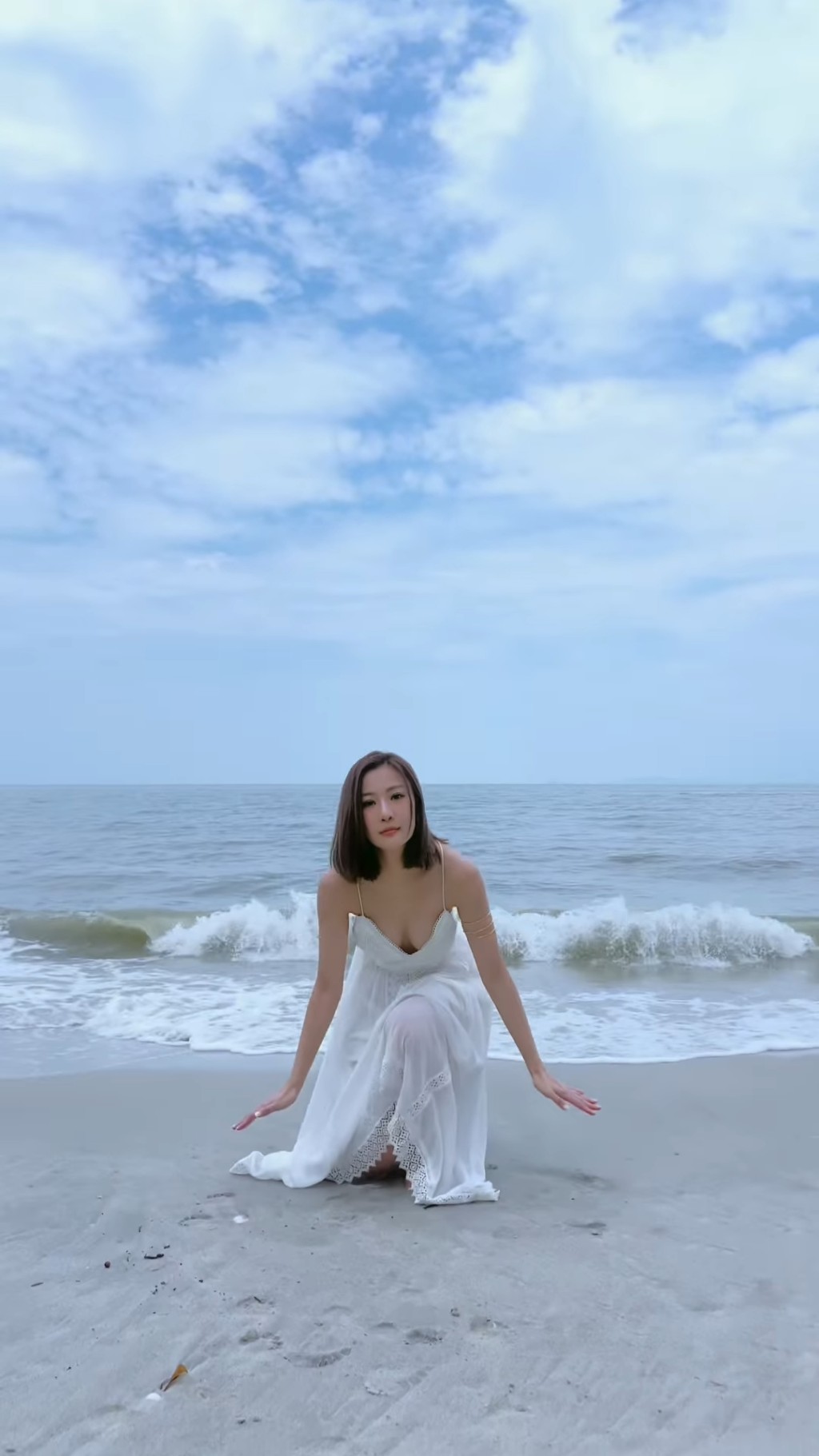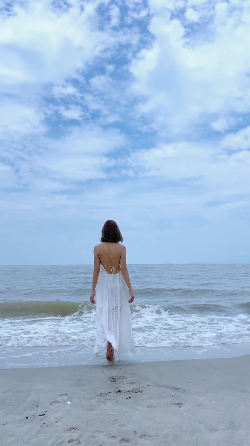 朱智贤日前已分享一条极速换衫影片,穿上T恤短裤的她站在沙滩,突然抛高一条白色吊带长裙,秒变身成为仙气美女。而昨日朱智贤再在IG贴出同一辑照片,原来是她早前到马来西亚出席婚礼做表演嘉宾时拍摄。朱智贤公开的多张照片,见到她一转身晒玉背,看起来是真空上阵,而且朱智贤转Pose时,更意外见到露出半个胸部,看到网民为她担忧,有随时走光的风险。