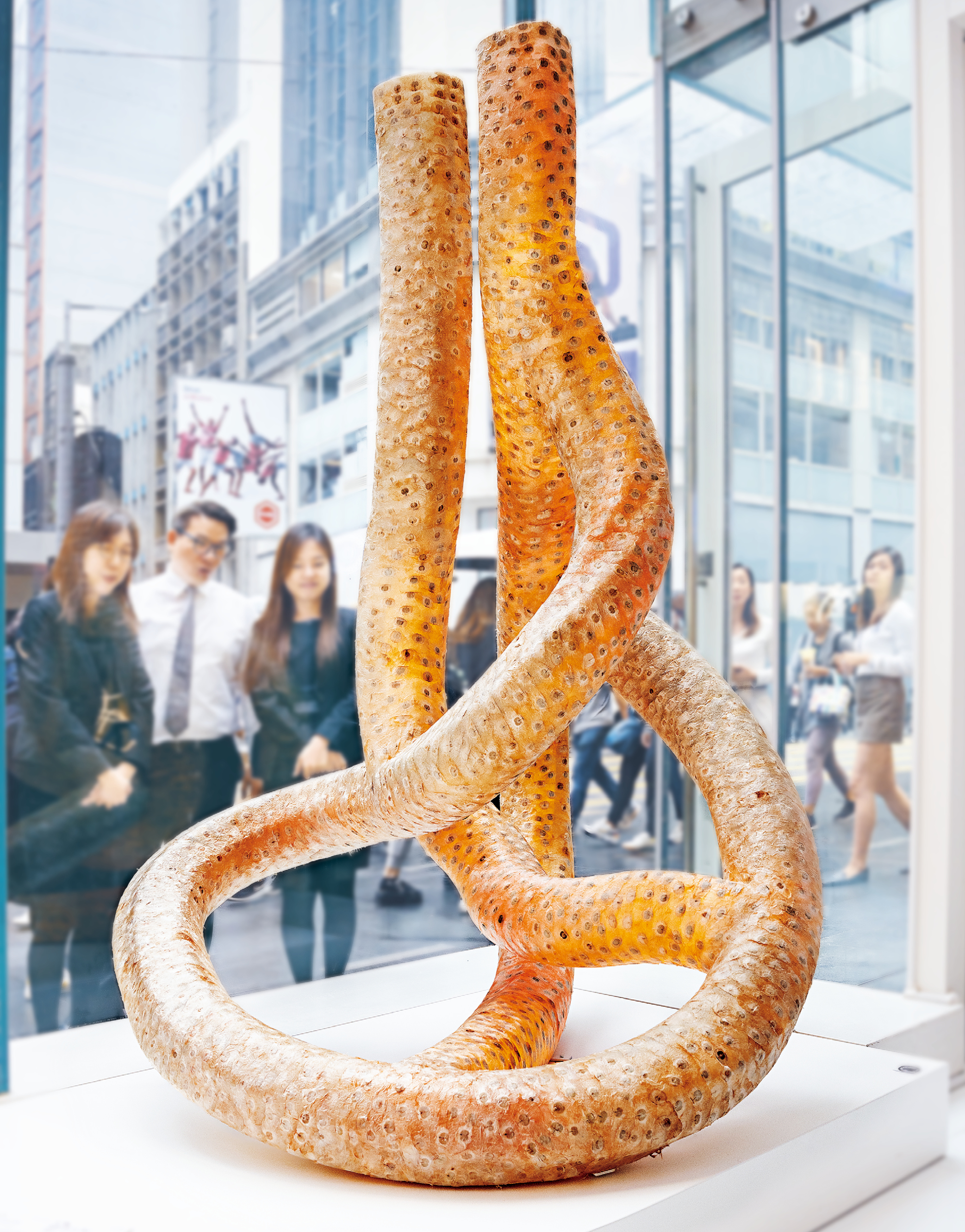 细看作品,雕塑由药用树材——木蝴蝶种子拼贴而成,当木蝴蝶果实成熟时,剑一样的豆荚悬挂在光秃秃的树枝上,当豆荚裂开,带着薄衣翅膀的圆形种子随风飘散,就像翩翩起舞的蝴蝶。作品为传统中药和工艺结合提出了新的可能性,为这一古老的知识赋予了重要的现代诠释。透过传统与现代元素之间的重塑和动感交流,表达了艺术家对保护文化遗产和文化意义的追求。