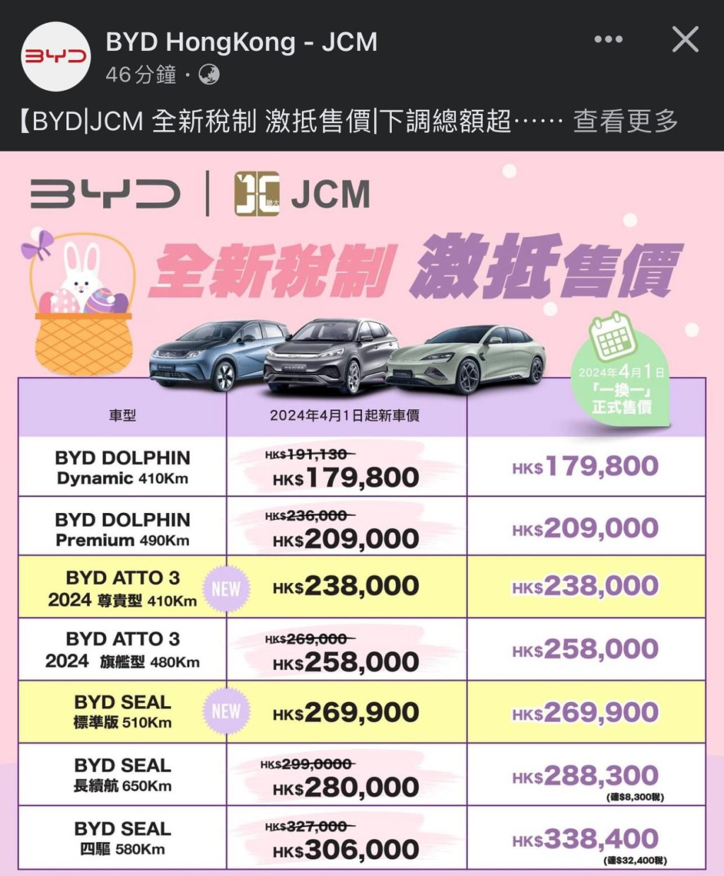 财爷上月发表的电动车“一换一”新税制对本地电动私家车市场带来冲击,不少原有车款在新税制下难免涨价了。为贯彻市场竞争力,有品牌旋即推出大件挫抵食、仍可获首次登记税全数宽减的新型号,也有品牌的个别车型索性减价,其中国产电动车品牌比亚迪(BYD ),代理联大汽车今日(3月20日)在专属社交平台facebook上公布了最新车系售价,并于4月1日起实施。
