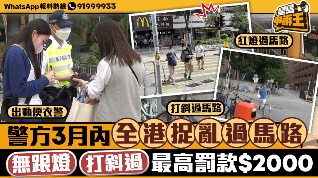 《星岛申诉王》日前报道,警方由3月18日起至3月内进行全港性大型执法行动,打击马路上的违例行为,除了捉司机各项不小心驾驶行为外,亦会派出便衣警员,票控乱过马路的行人,例如“红公仔”时过马路,甚至在绿灯时打斜过马路,同样一经定罪最高罚款2千元。警方提醒市民,为安全计,应谨记遵守交通规则。