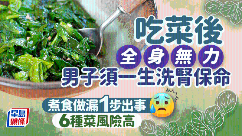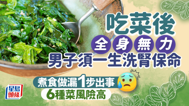 吃菜也会导致洗肾? 内地宁波一名60岁男子进食菠菜后全身乏力,求医后发现患急性肾损伤,需要终生洗肾保命。 医生指,该男子煮菜前做漏1步骤,导致进食后肾脏受损,医生也提醒,不妥当处理5种菜,引发肾病风险较高。