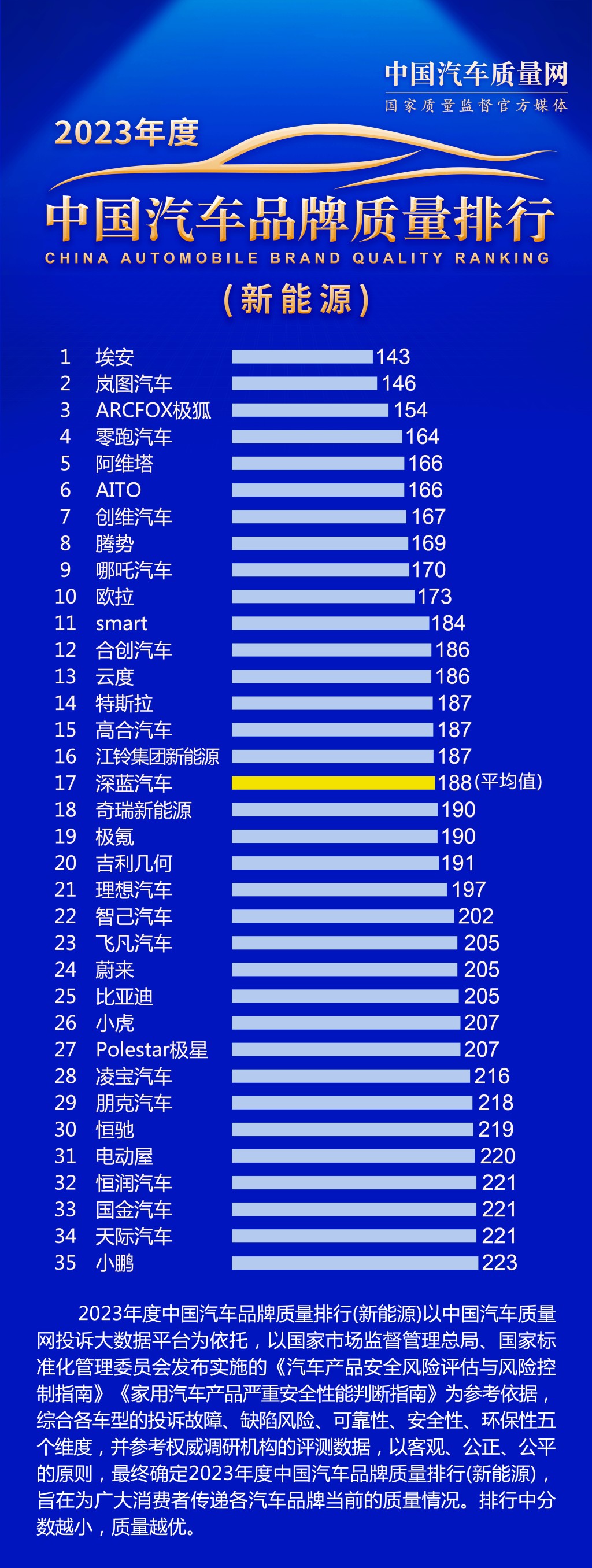 前阵子,中国权威机构:中国汽车品牌质量排行公布了国产新能源车于2023年的整体评分,该榜以中国汽车品质网的投诉大数据为基础,并以国家市场监督管理总局、国家标准化管理委员会发布实施的《汽车产品安全风险评估与风险控制指南》、《家用汽车产品严重安全性能判断指南》为参考依据,综合各车型的投诉故障、缺陷风险、可靠性、安全性及环保的五大核心因素,并参考权威调查机构的评测数据釐定结果,涵盖35家新能源车品牌,榜中分数愈少代表评分愈优越,排行榜分开10项,包括新能源车品牌、微型车辆、紧凑型车辆(小车)、中型车辆、中大型车辆、小型SUV、紧凑型SUV、中型SUV、中大型及大型SUV、MPV等以供消费者参考用。