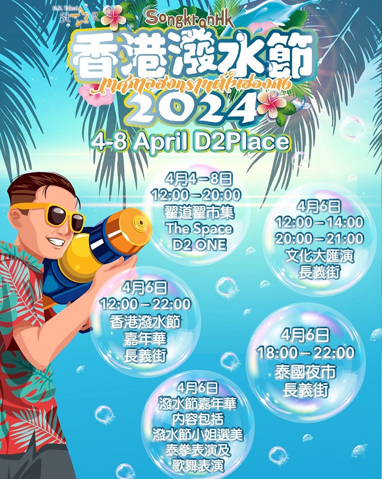 由HK Talent Star及泰二代Vita主办的第10届香港泼水节将于4月5日起,一连5日在荔枝角D2 Place举行!而最热闹的泼水环节“激FUN水战派对”,则会在4月6日于长义街举行,届时参加者可自携各种水枪及水桶,尽情向其他人射水、喷水,进行水战!