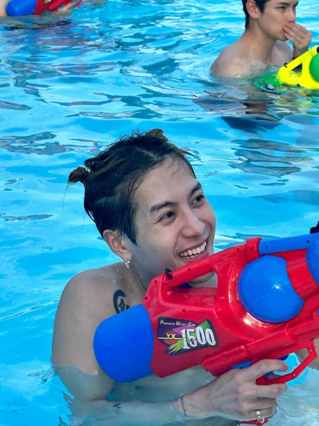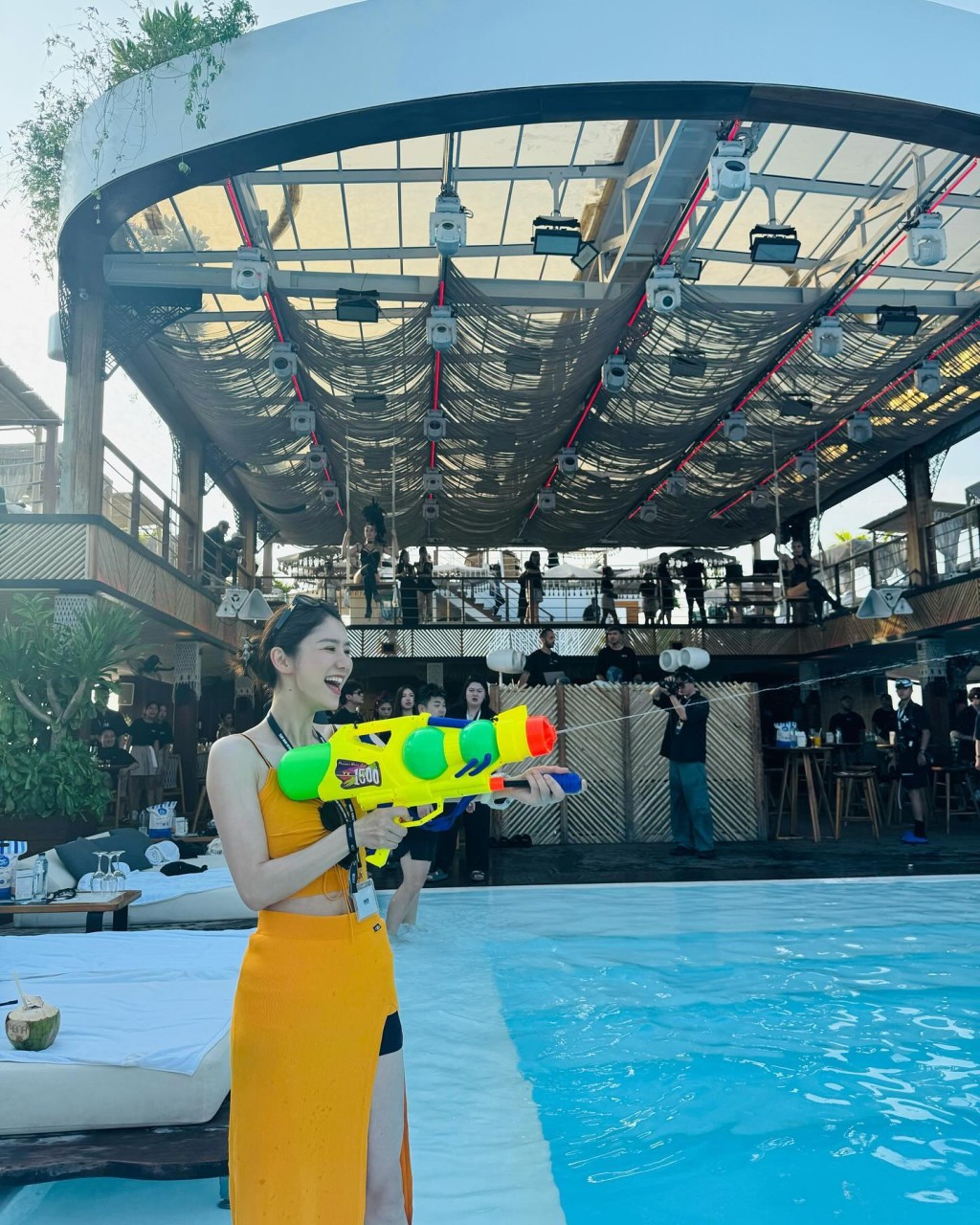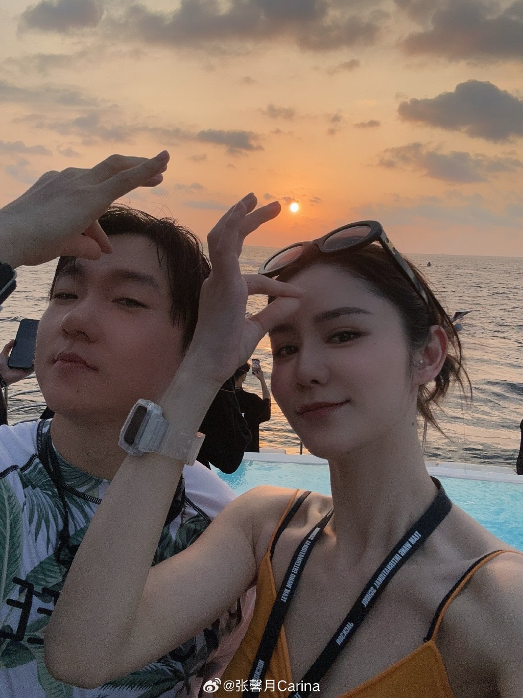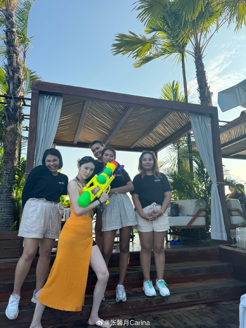 张馨月近日在多个不同社交网分享多辑照片,只见她穿上一件橙色吊带上衣,露出一条小纤腰,下身虽然穿上同款同色长裙,但露出一边白滑长腿,非常吸睛。这位人妻更于泳池边玩水枪,而在泳池中同样手持水枪的,则是韩国男团GOT7成员王嘉尔,之后张馨月更晒出两人头贴头的合照,陈敏之见到两人的合照都留言指好羡慕,而张馨月则回覆回来再聚。此外,当一艘写上“HBD JACKSON”的游艇驶近时,张馨月更大派心心。原来这辑照片是早前王嘉尔在28日庆祝30岁生日,在布吉大开派对所拍。