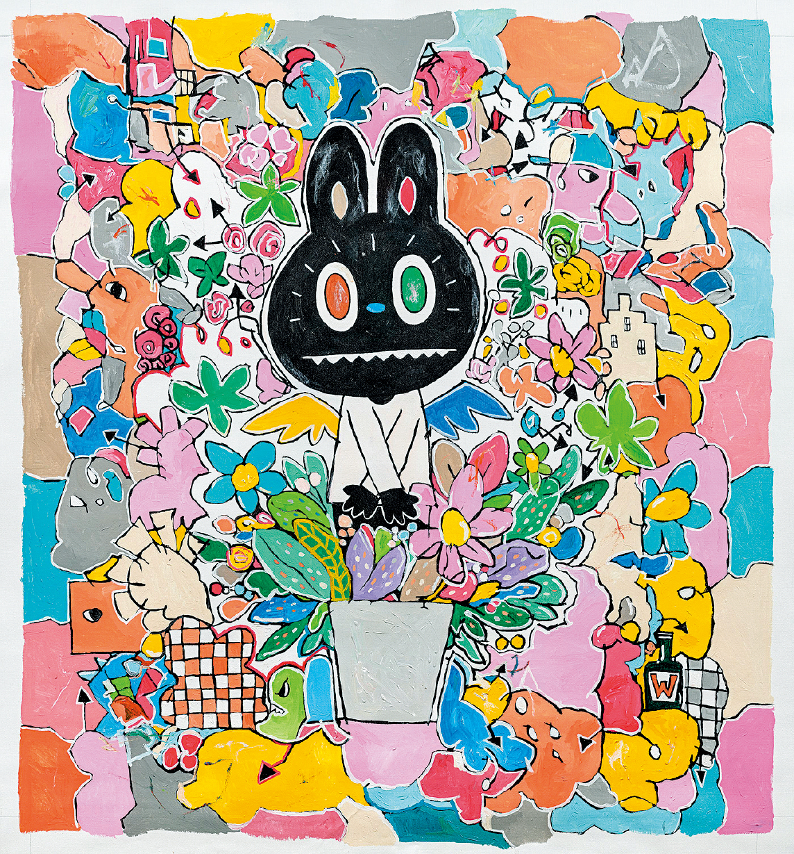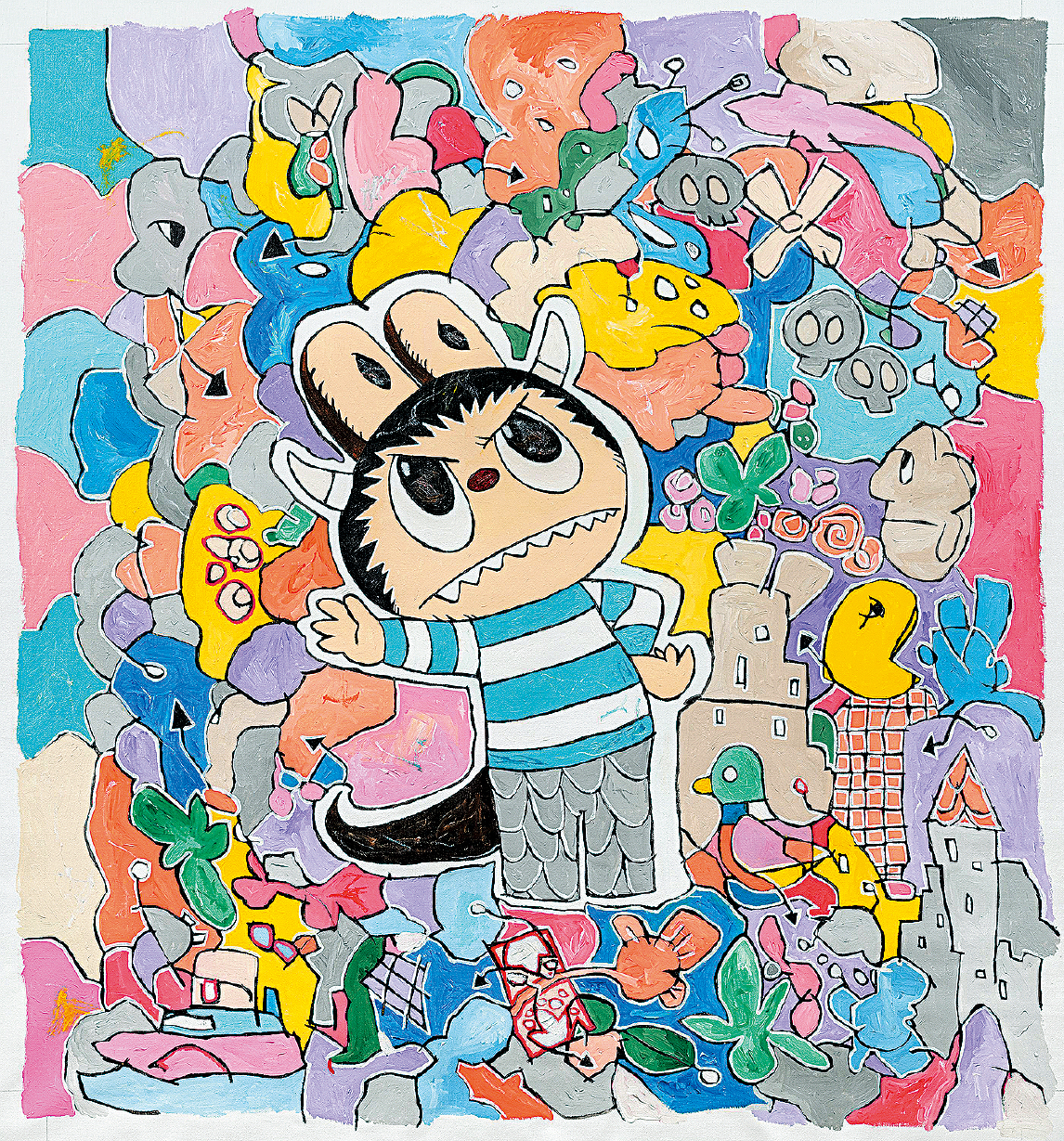 阔别香港已有7年的Kasing,曾在世界不同地域展出作品,他直言还是最想回港办展览。 这位因创作The Monsters精灵系列及当中主角Labubu而在文化艺术领域闯开新天地的人气绘本作家,终在今年的艺术月重临出生地。 现正在中环置地广场举行的大型展览,以设于中庭的画廊为核心展区,这个犹如被精灵角色剪影包围的特色画廊,展出共25幅全新画作,部分接近2米高,最为吸引大家驻足欣赏的作品,必然是点题作品“EVERYBODY KNOWS”的3幅系列式画作。 所谓Everybody Knows,其实是指存在于世界上种种不同的社会及生活议题,全都是每个人都知道的,然而大家却没有说出来,创作者就透过绘画将之表达。