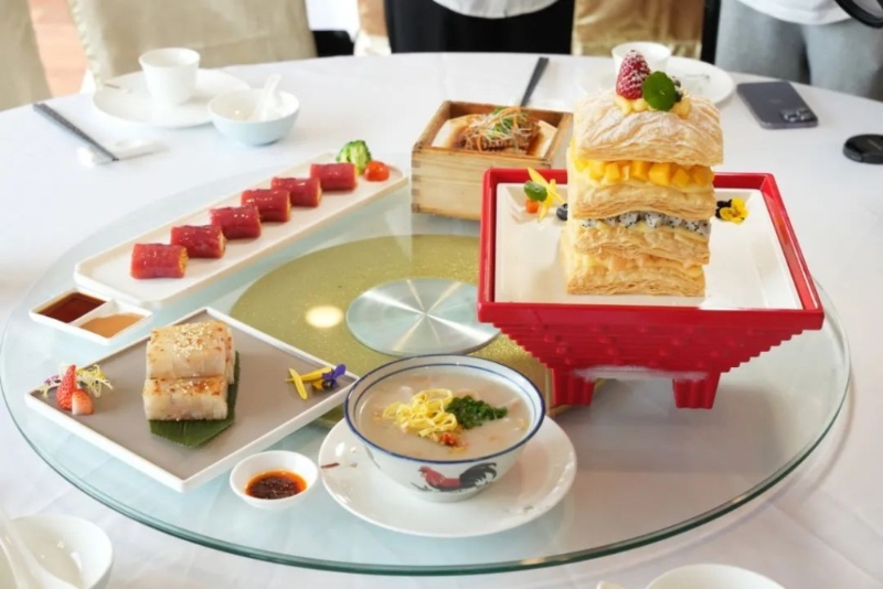 三人套餐,美食包括:至尊双黄粽、西关非遗水菱角、脆皮鲜虾红米肠、沙茶白玉金钱肚、腊味煎萝卜糕、法式鲜果拿破仑。 (原价¥552,优惠价¥248)