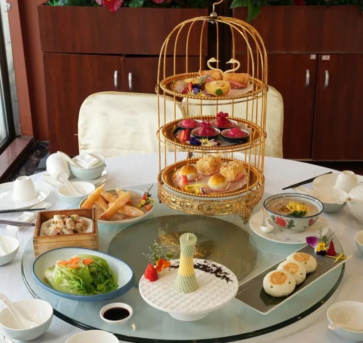 观景位三人套餐¥398:天鹅酥、高筒葡挞、流星球、豉汁蒸排骨、四色虾饺、王子手工墨鱼饼、凤翅酱香蒸凤爪、白灼宁夏菜心、红丝绒蛋糕。